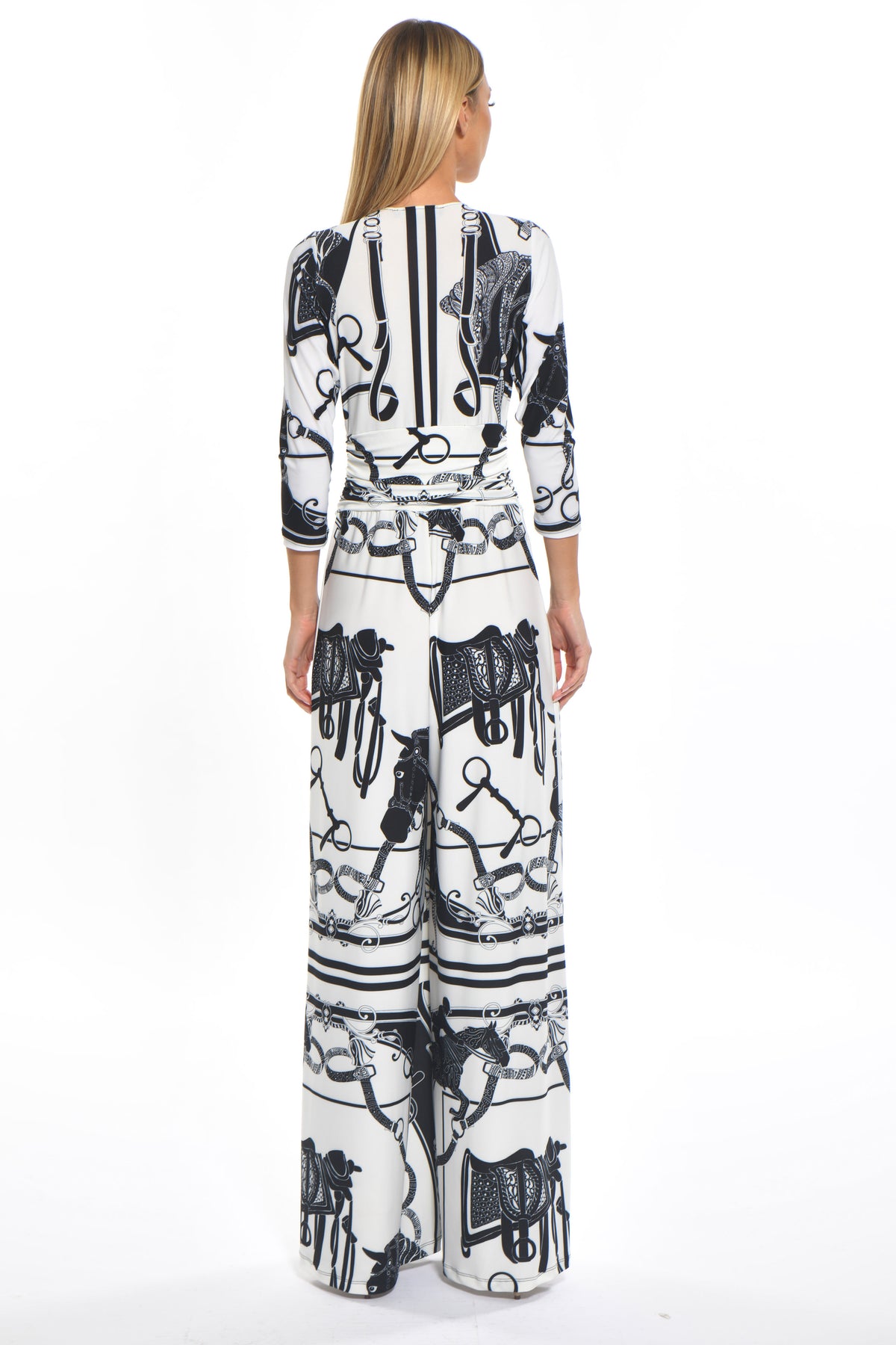 A timeless Julian Chang silhouette reimagined in the striking Rome print. This wide-leg jumpsuit features a plunging V-neckline, cinched waist, and flowing legs that elongate the figure with ease. Crafted in wrinkle-resistant stretch fabric, it offers comfort and sophistication in equal measure—making it a polished choice for travel, evenings out, and statement-making moments.