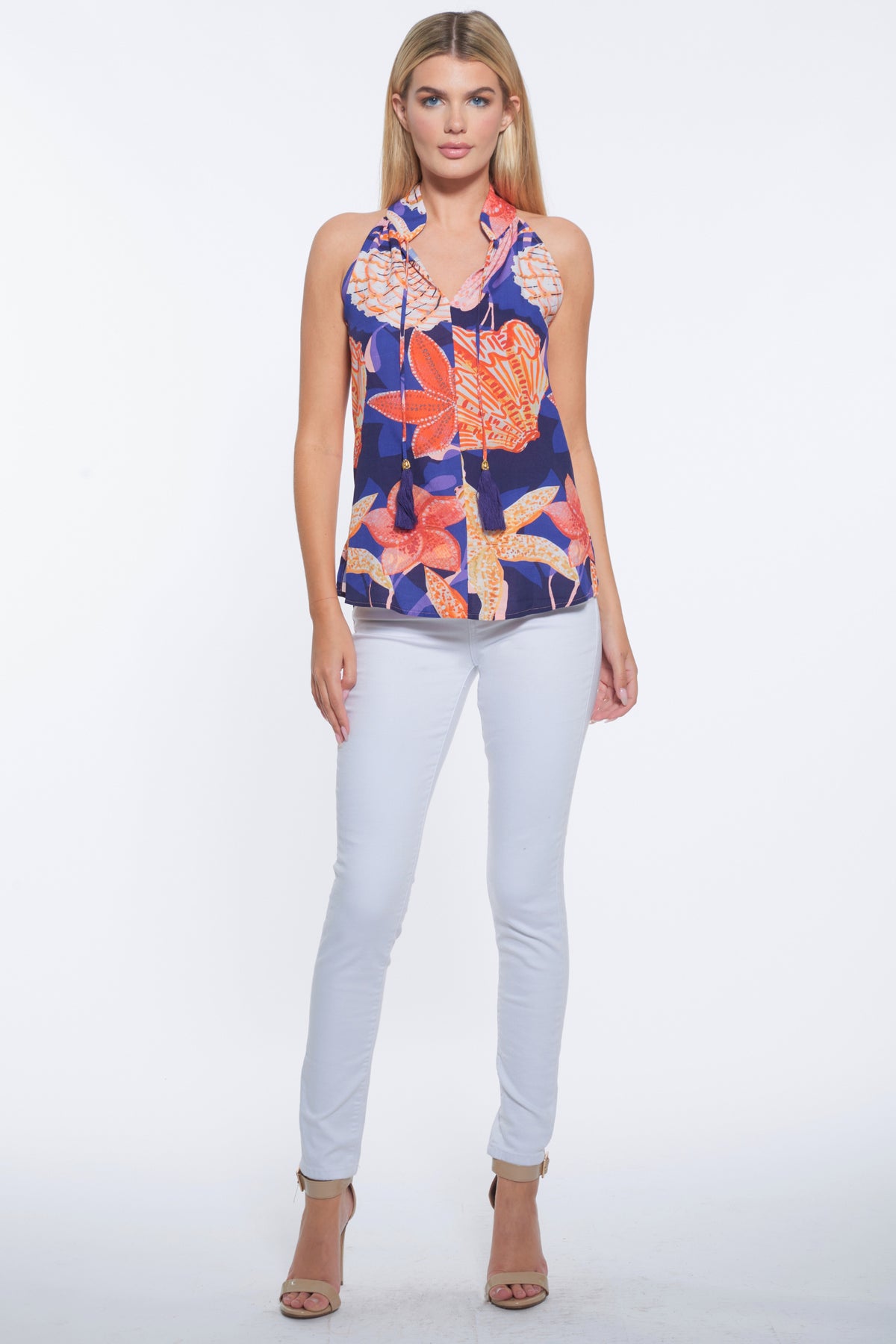 Bold yet refined, this sleeveless halter silhouette captures the spirit of effortless summer glamour. A soft keyhole neckline and relaxed drape flatter every curve, while the vibrant Adventure print—woven in shades of cobalt, tangerine, and ivory—evokes the energy of faraway destinations. Lightweight and fluid, it transitions seamlessly from coastal brunches to gallery evenings with confident ease.