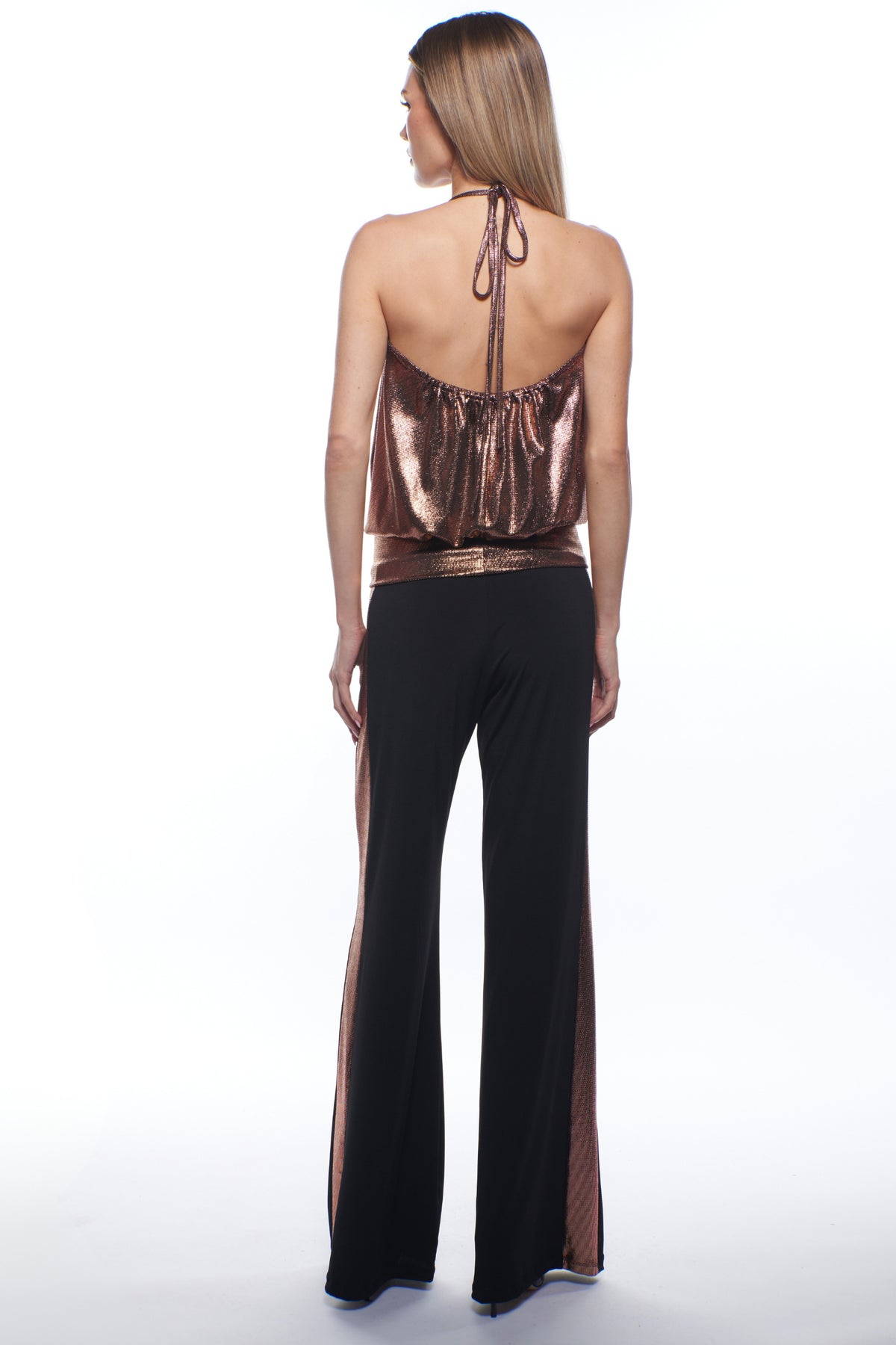 Shimmering with liquid metallic allure, this halter silhouette exudes effortless sophistication and sultry charm. The soft cowl neckline and open back highlight graceful lines, while the adjustable tie-neck detail ensures a flawless fit. Designed to move with you, it catches the light beautifully from rooftop cocktails to after-hours soirées.