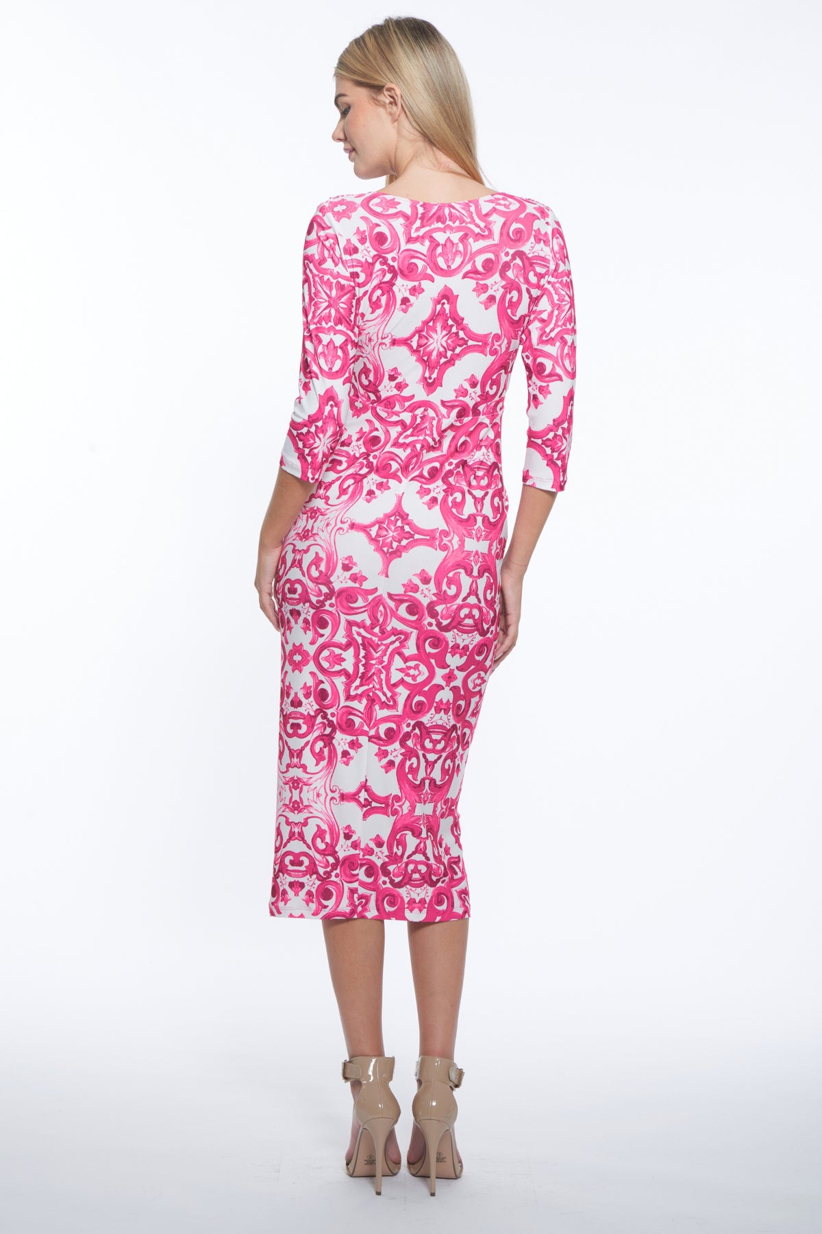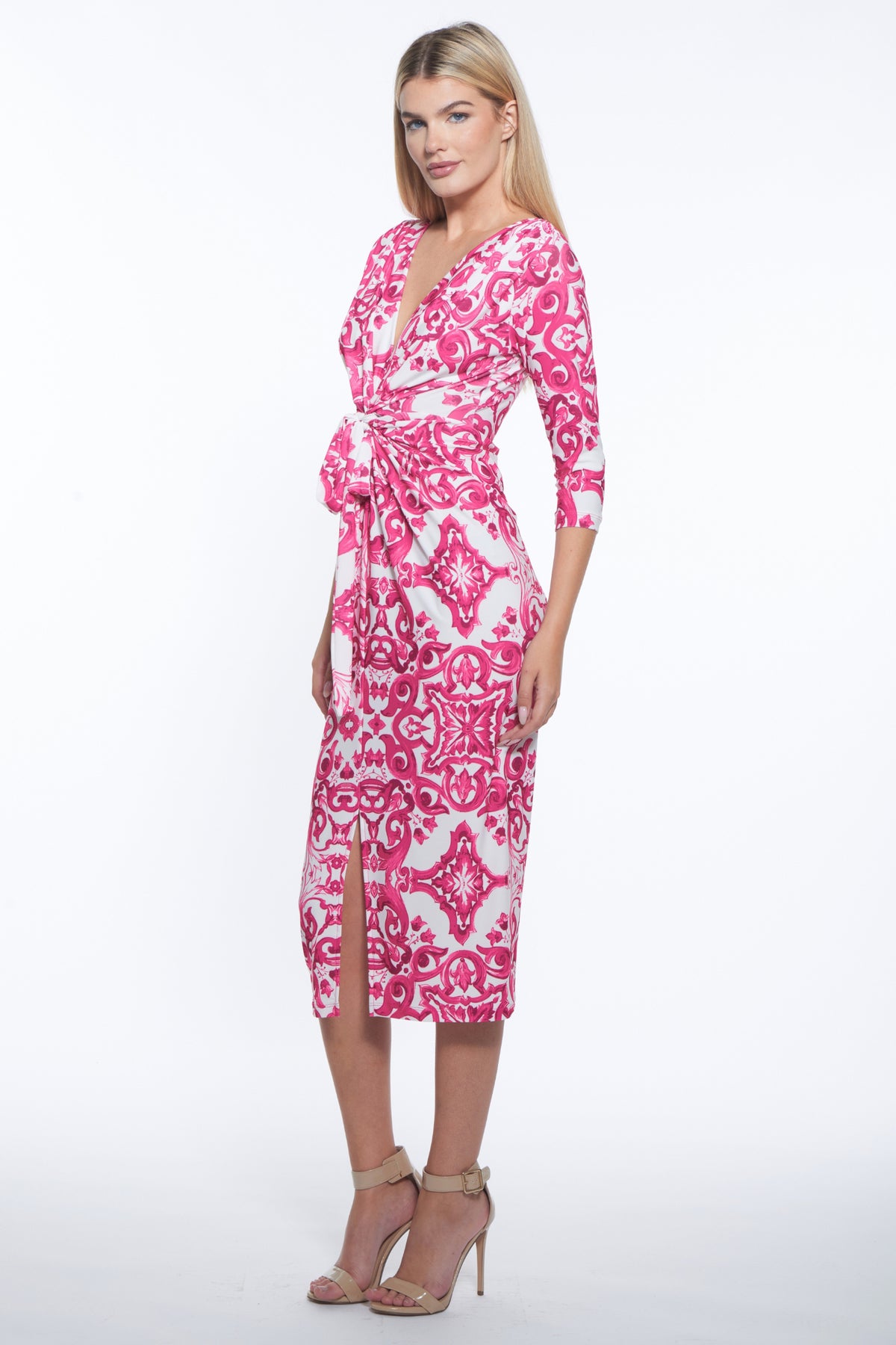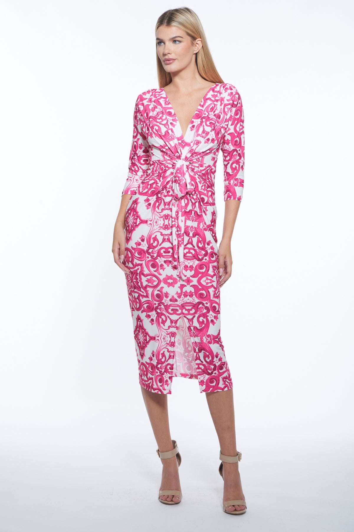 Feminine and versatile, this midi dress is designed with a deep V-neckline, flattering waist knot detail, and slim 3/4 sleeves. The Dolce print brings a bold yet refined energy, while the curve-skimming silhouette and front slit strike the perfect balance of elegance and ease. Wrinkle-resistant and travel-ready, it transitions effortlessly from brunch to evening gatherings.