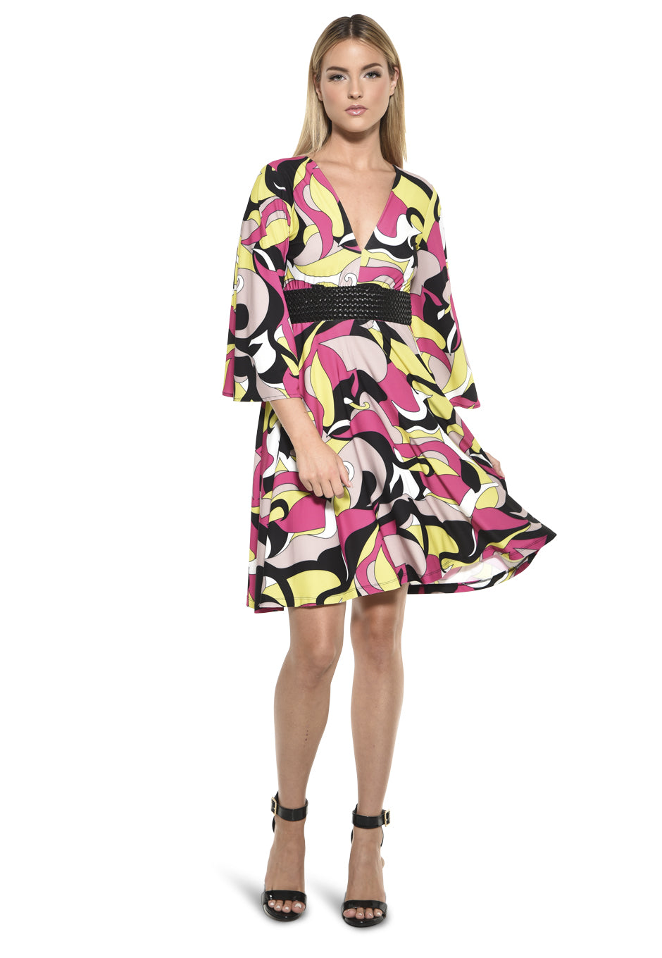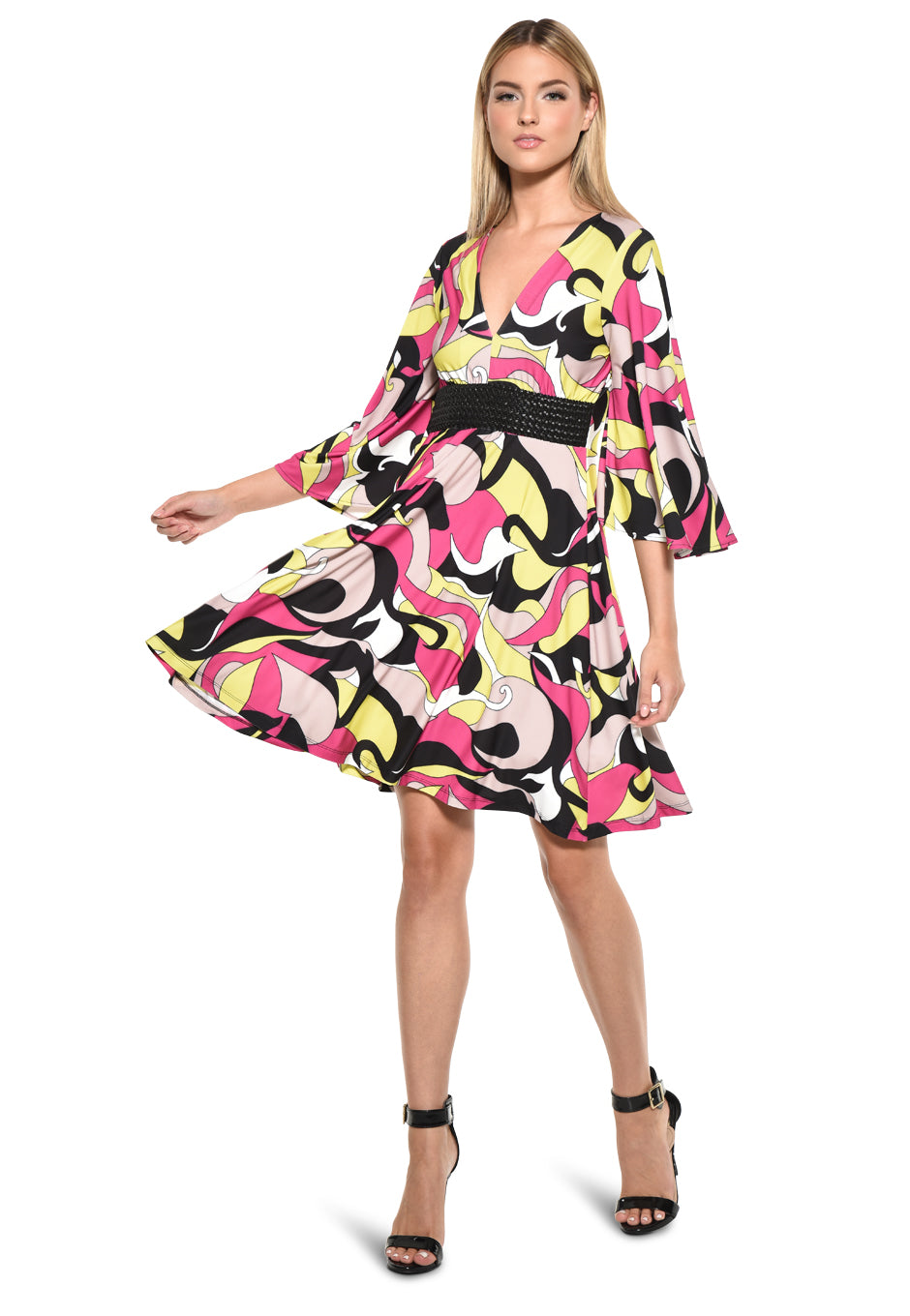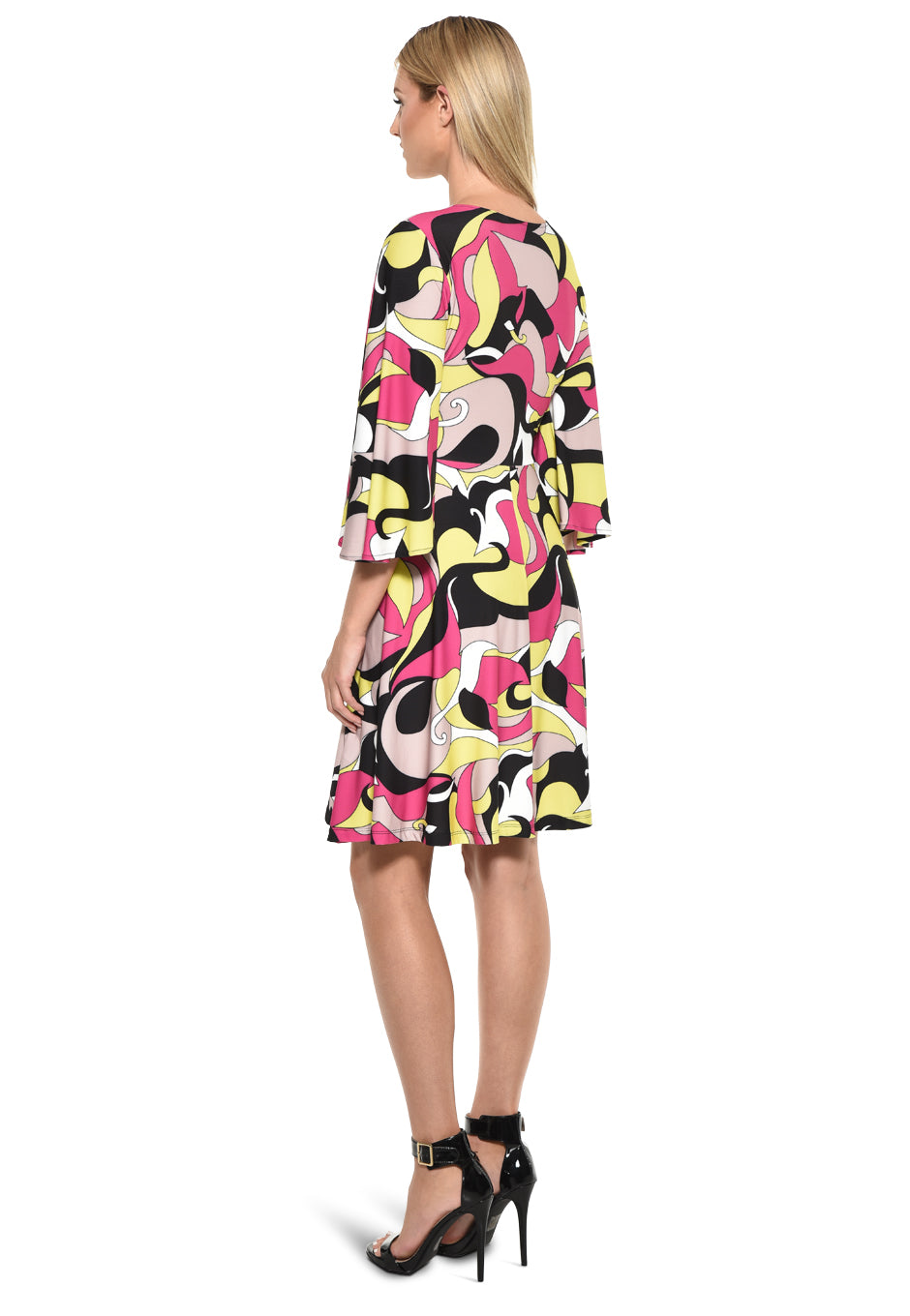 Turn heads and make a statement with the vibrant Corner Dress in Delight Print by Julian Chang. This eye-catching dress features a bold, abstract print in a vivid mix of pink, yellow, black, and white. The flowing, knee-length silhouette and deep V-neckline add a touch of elegance and flirtatiousness, while the bell sleeves bring an air of playful femininity. Perfect for daytime events or evening soirées, this versatile dress combines fun, comfort, and chic style in one standout piece. Pair it with your favorite heels for a head-turning look.