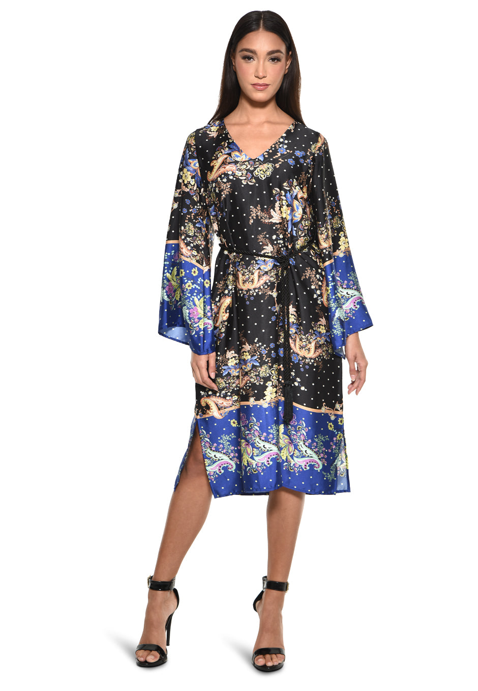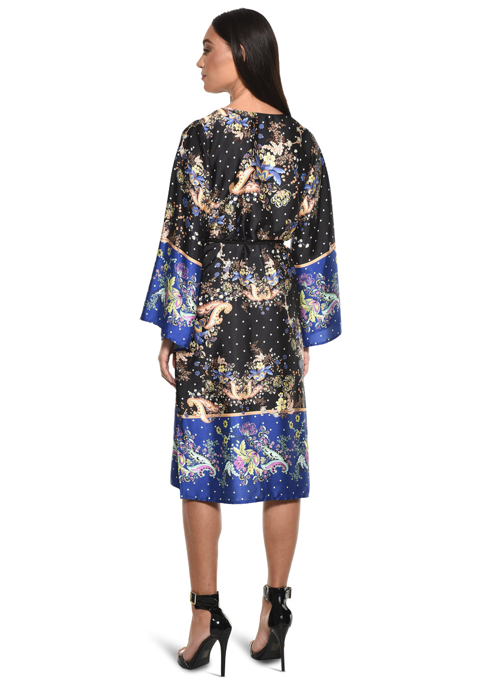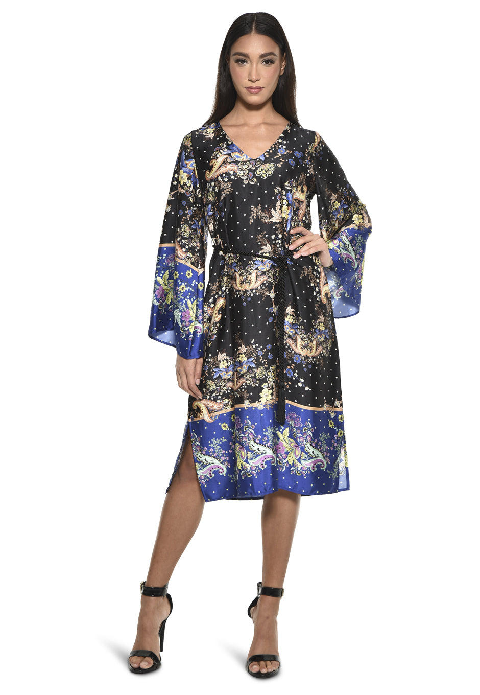 Step into elegance with the Deborah Dress in Allegra Print by Julian Chang. This stunning knee-length dress features a sophisticated wrap style with a deep V-neckline and adjustable belt for a custom fit. Its captivating Allegra print boasts a bold mix of florals and paisley, accented with striking polka dots and a rich color palette. The flowy bell sleeves and side slit details add a touch of effortless charm, making this dress a perfect choice for day-to-night versatility.