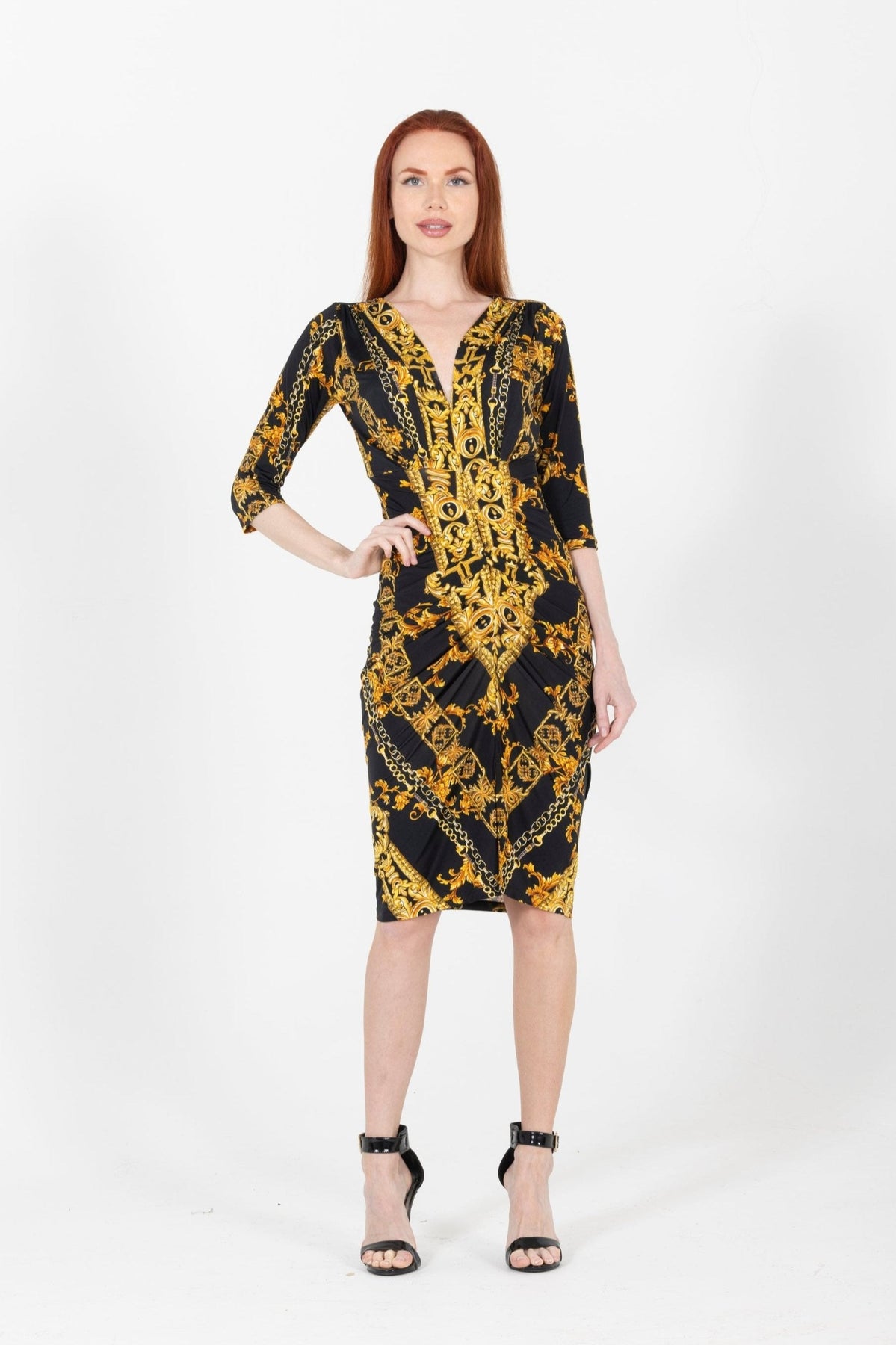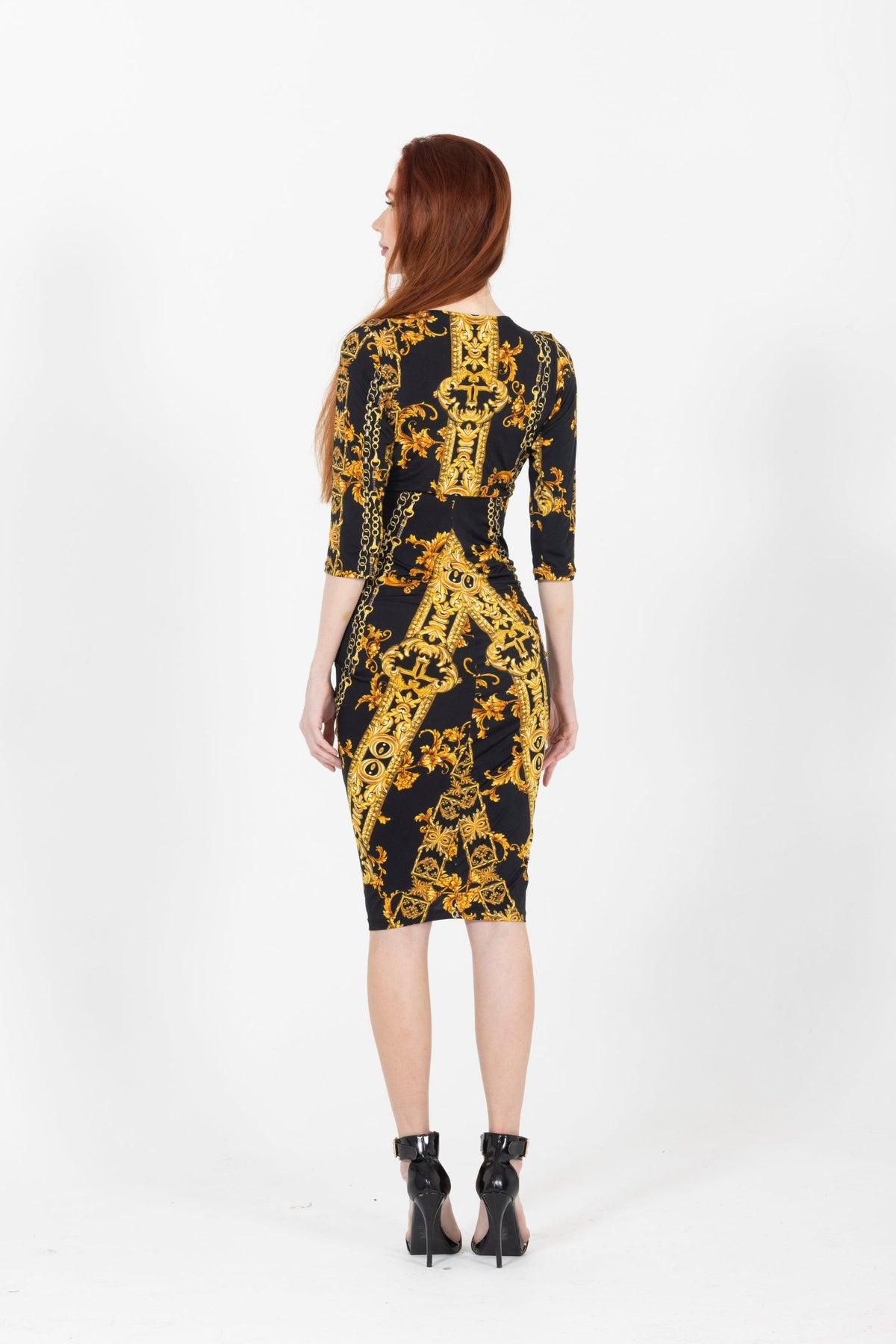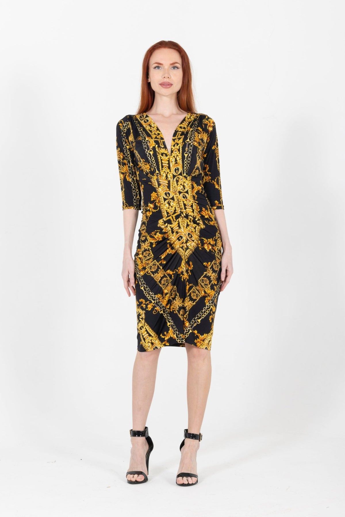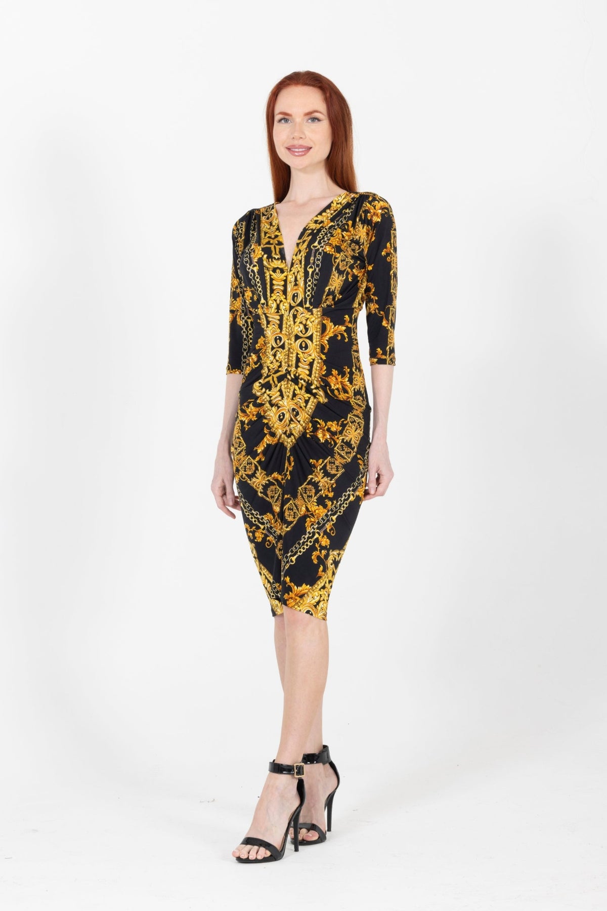 This chic Dress in Versalles Print brings sophisticated style to any event. Designed with a tailored, slim-fit silhouette, it’s the perfect option for cocktail parties or evening outings. The bold Versalles Print adds a touch of modern elegance.