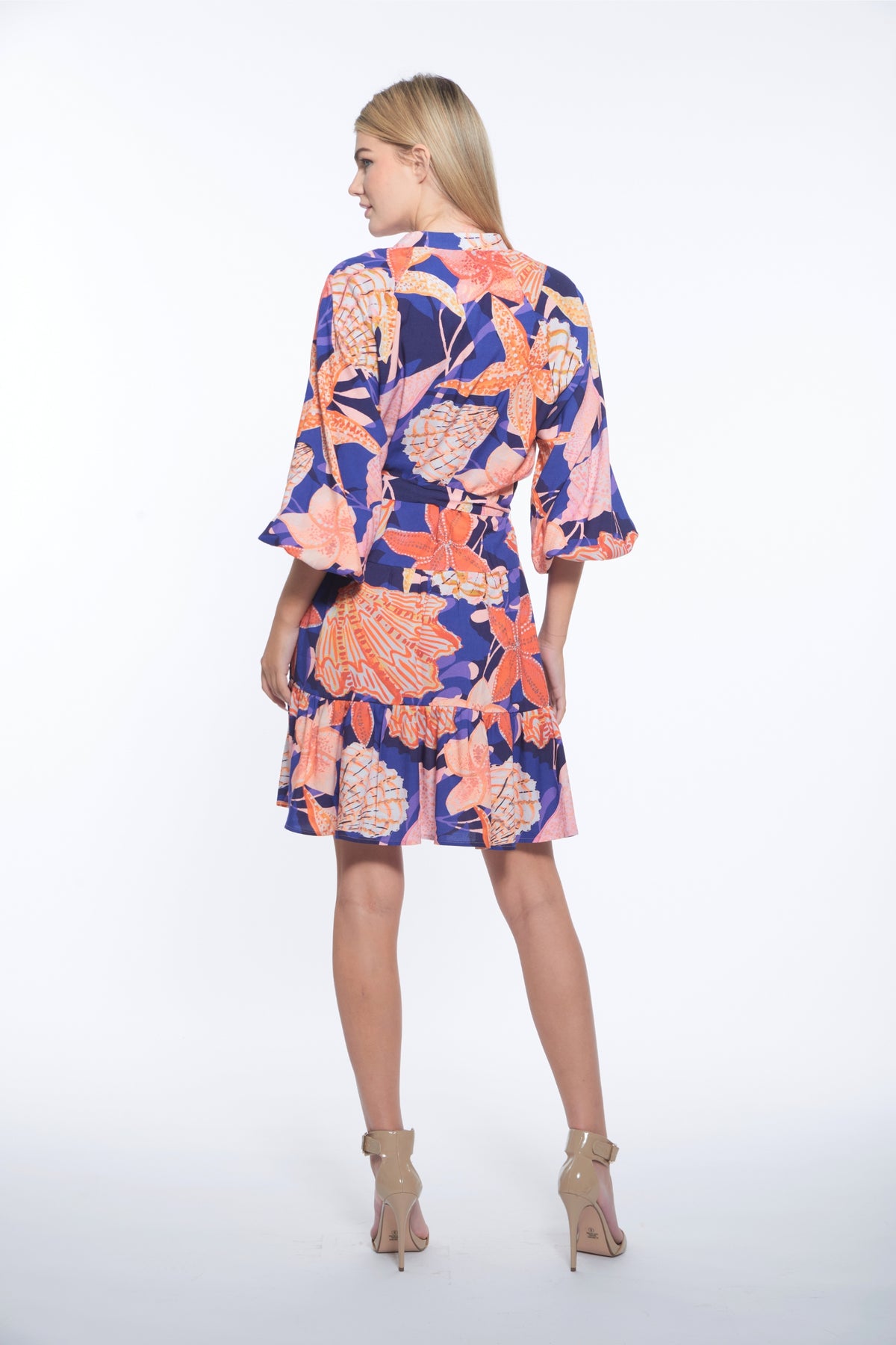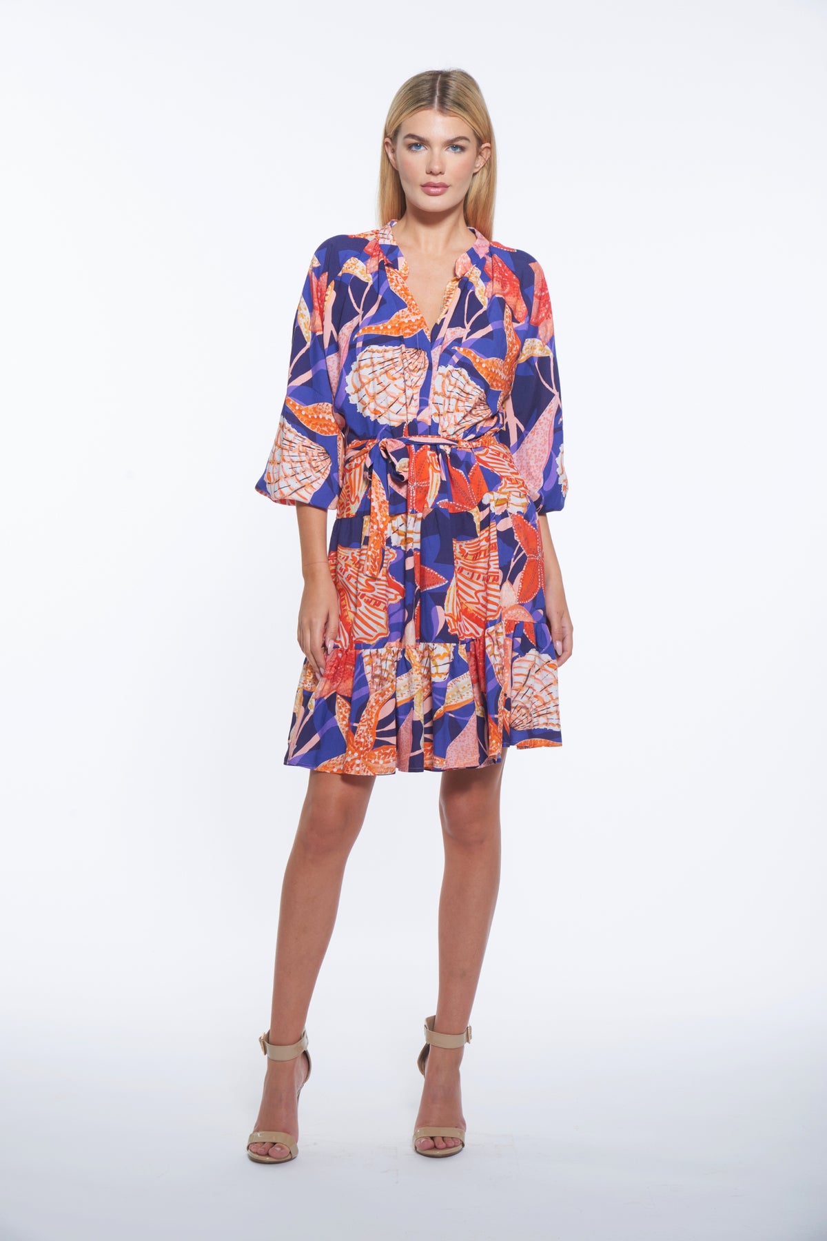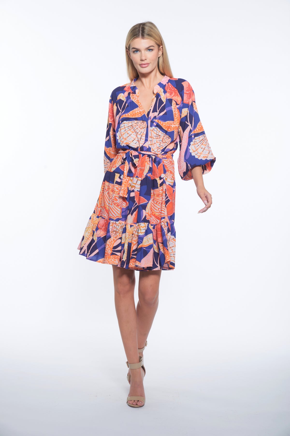 Make a statement this season in the Flor Dress in Adventure Print. This relaxed yet tailored shirt-dress features 3/4 bell sleeves, a self-tie waist, and a lively tropical print that evokes endless summer vibes. From resort escapes to weekend brunches, this dress is designed to move with you in both comfort and color.