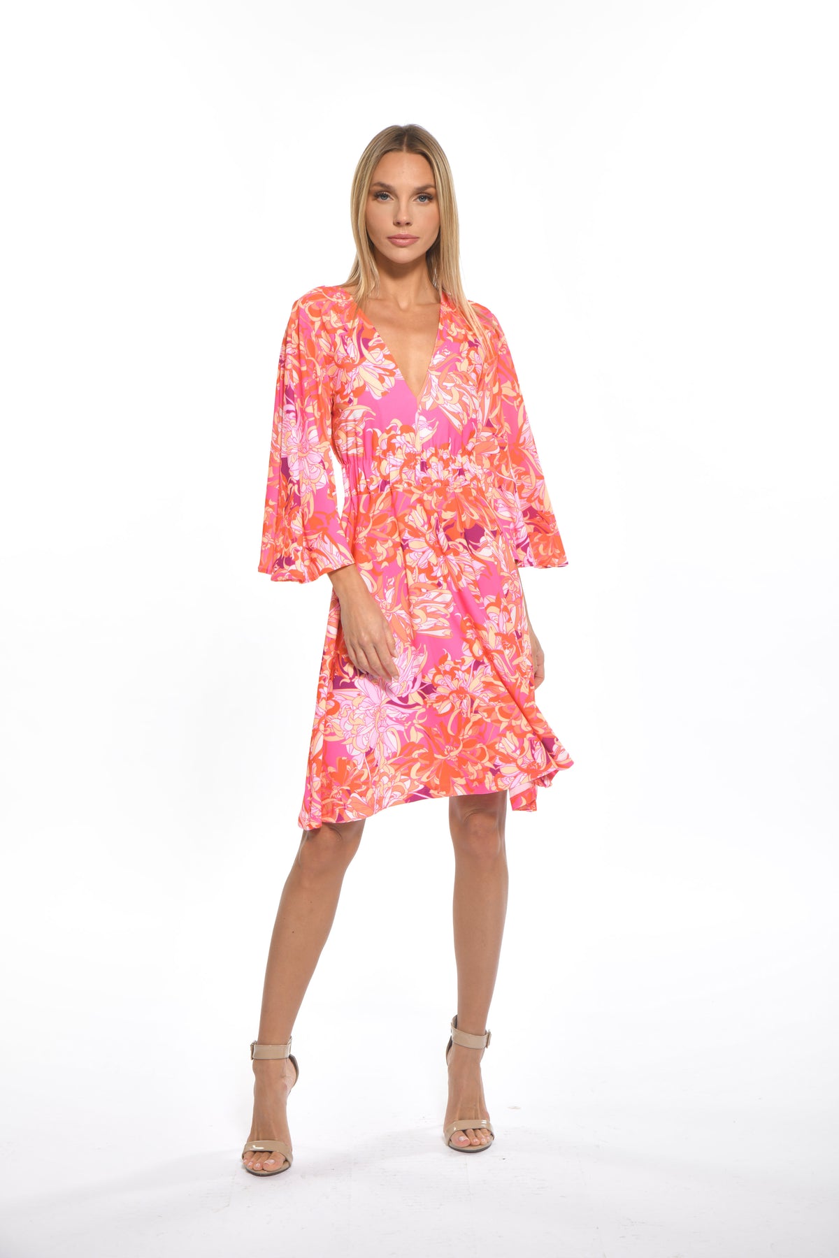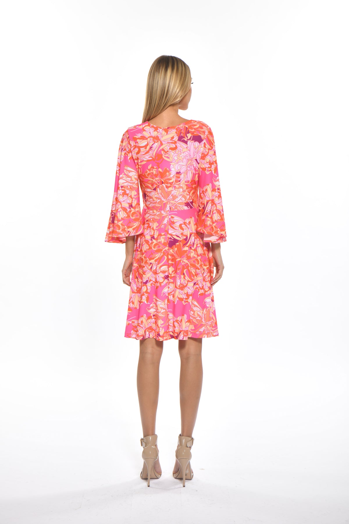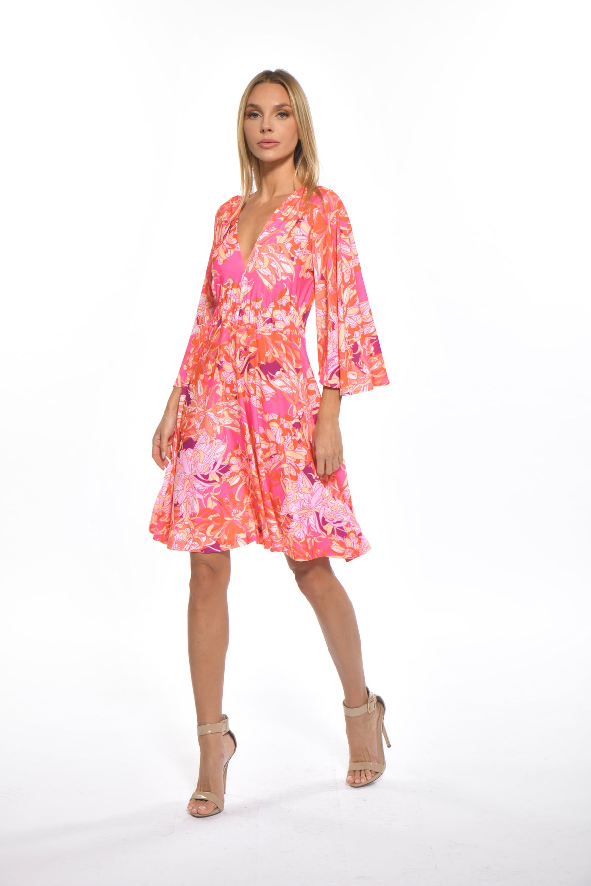 Frank Dress is a delightful knee-length dress featuring a charming pink floral pattern. The dress has 3/4 sleeves, adding a touch of sophistication and versatility. Its V-neck design enhances the neckline, creating an elegant and flattering silhouette. The overall aesthetic is feminine and vibrant, making it an ideal choice for various occasions, from casual outings to more formal events. The pink floral motif adds a playful and romantic element to the dress, making it a stylish and eye-catching wardrobe piece.