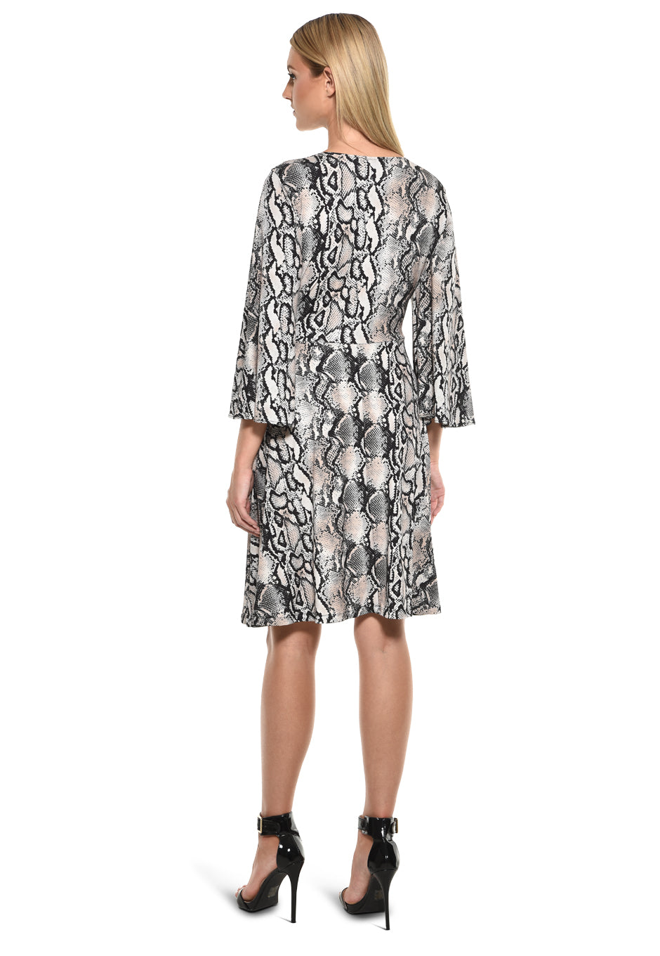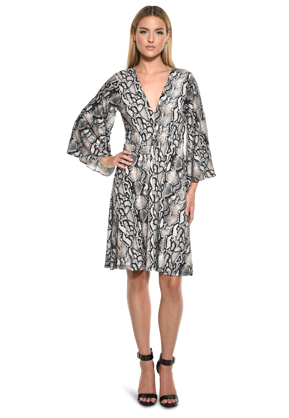 Unleash your wild side with the Julian Chang Frank Dress in Snake Print. This daring dress combines a bold print with a classic silhouette, making it a versatile addition to your wardrobe. The Frank Dress features a deep V-neckline, three-quarter bell sleeves, and an A-line skirt, offering both comfort and style for any occasion.
