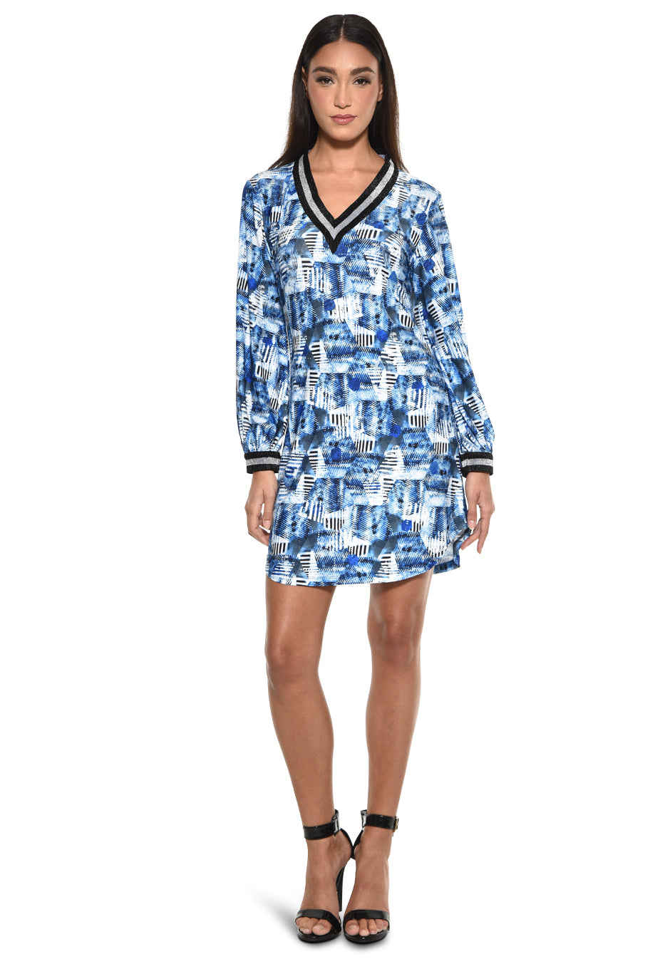 Make a statement with the Jojo Dress in Ink Print by Julian Chang. This stunning dress features a bold, abstract pattern in striking shades of blue, black, and white. Designed with a V-neckline adorned with contrasting trim, it exudes effortless elegance while maintaining a modern edge. The long sleeves are finished with subtle cuffs, offering a sophisticated touch to this playful piece. Perfect for any occasion, whether you're out for brunch or a night out on the town, the Jojo Dress brings both comfort and style with its relaxed fit and eye-catching design. Dress it up with heels, or go casual with flats – either way, you’ll turn heads.