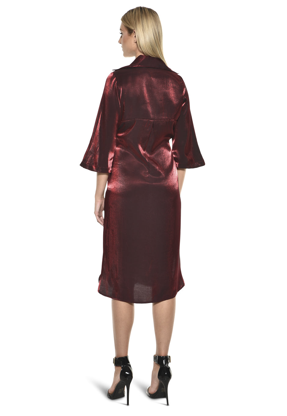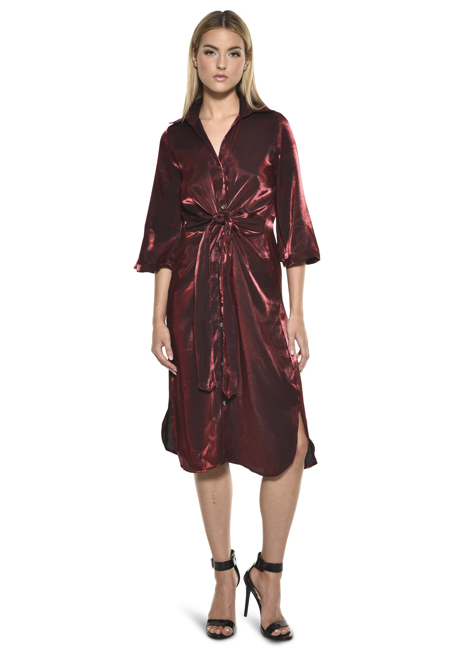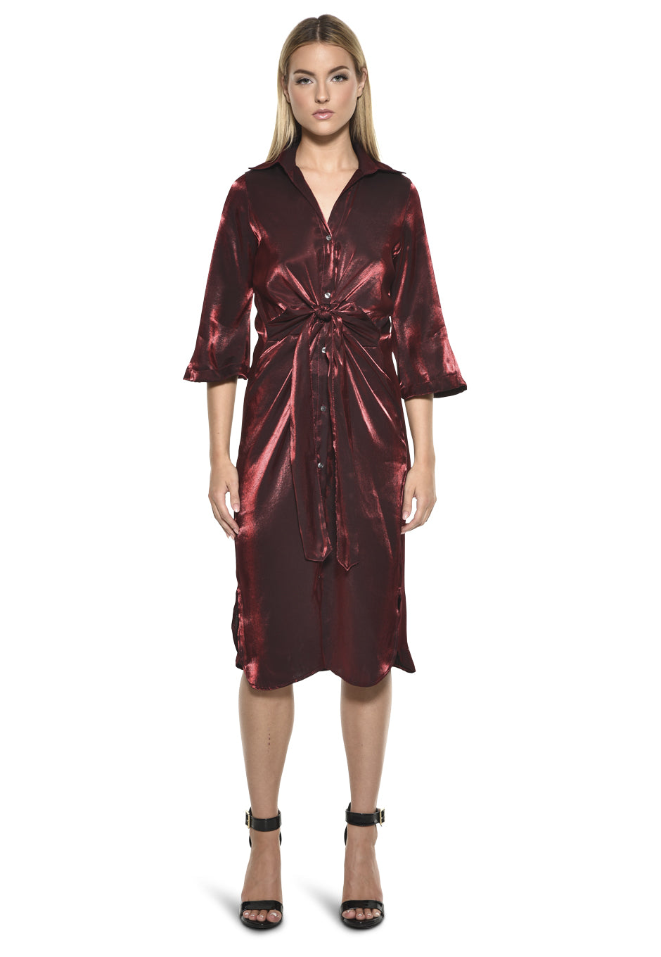 Turn heads in the captivating Jules Dress. Crafted in a lustrous redshine fabric, this knee-length dress radiates sophistication with its flattering tie-front detail that cinches the waist elegantly. Featuring 3/4 sleeves and a sleek button-up design, it strikes the perfect balance between modern style and classic elegance. Whether you're attending a cocktail party or a formal event, the Jules Dress ensures you'll make an unforgettable statement.