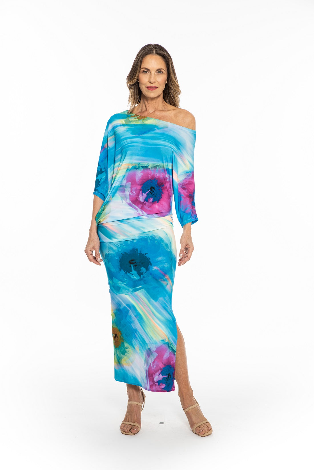 Simply stunning, our Mariel Dress by Julian Chang is a dream come true! This unique style features an asymmetrical off the shoulder neckline, 3/4 length sleeves.