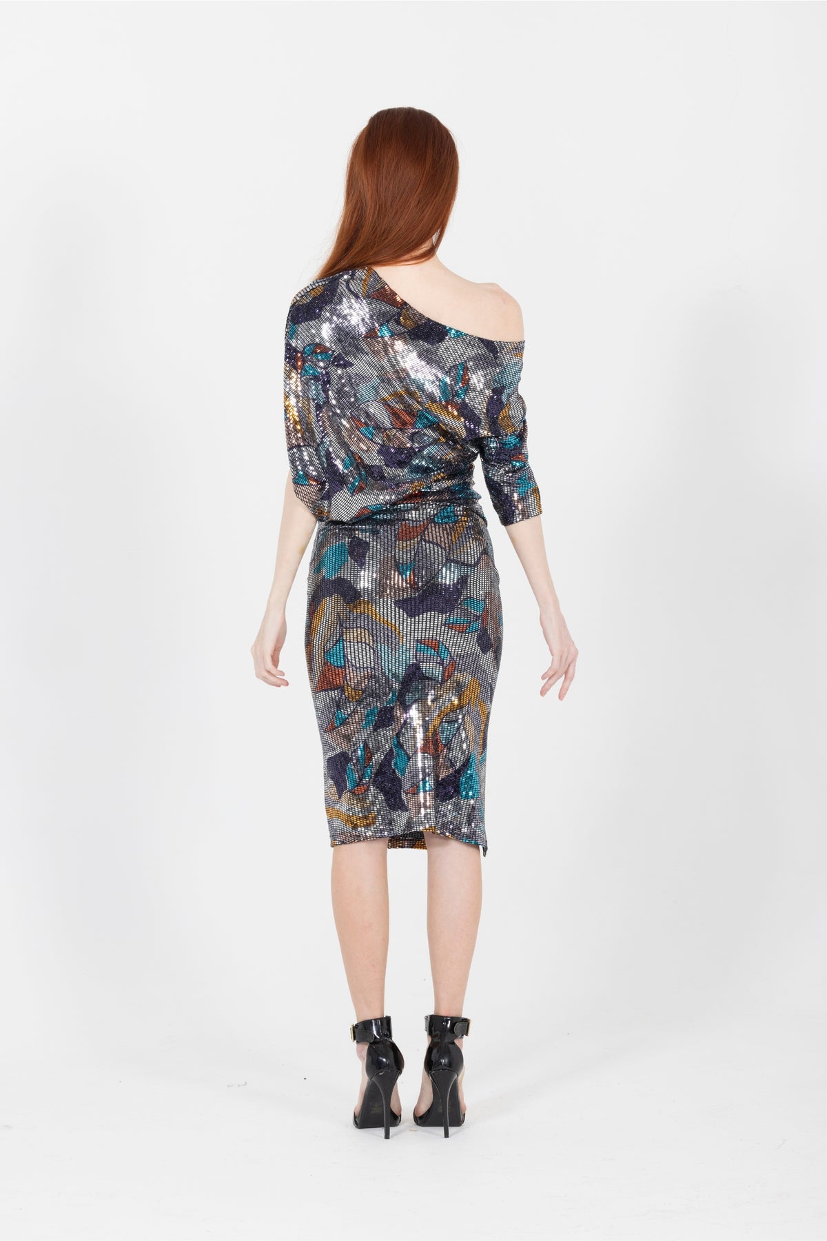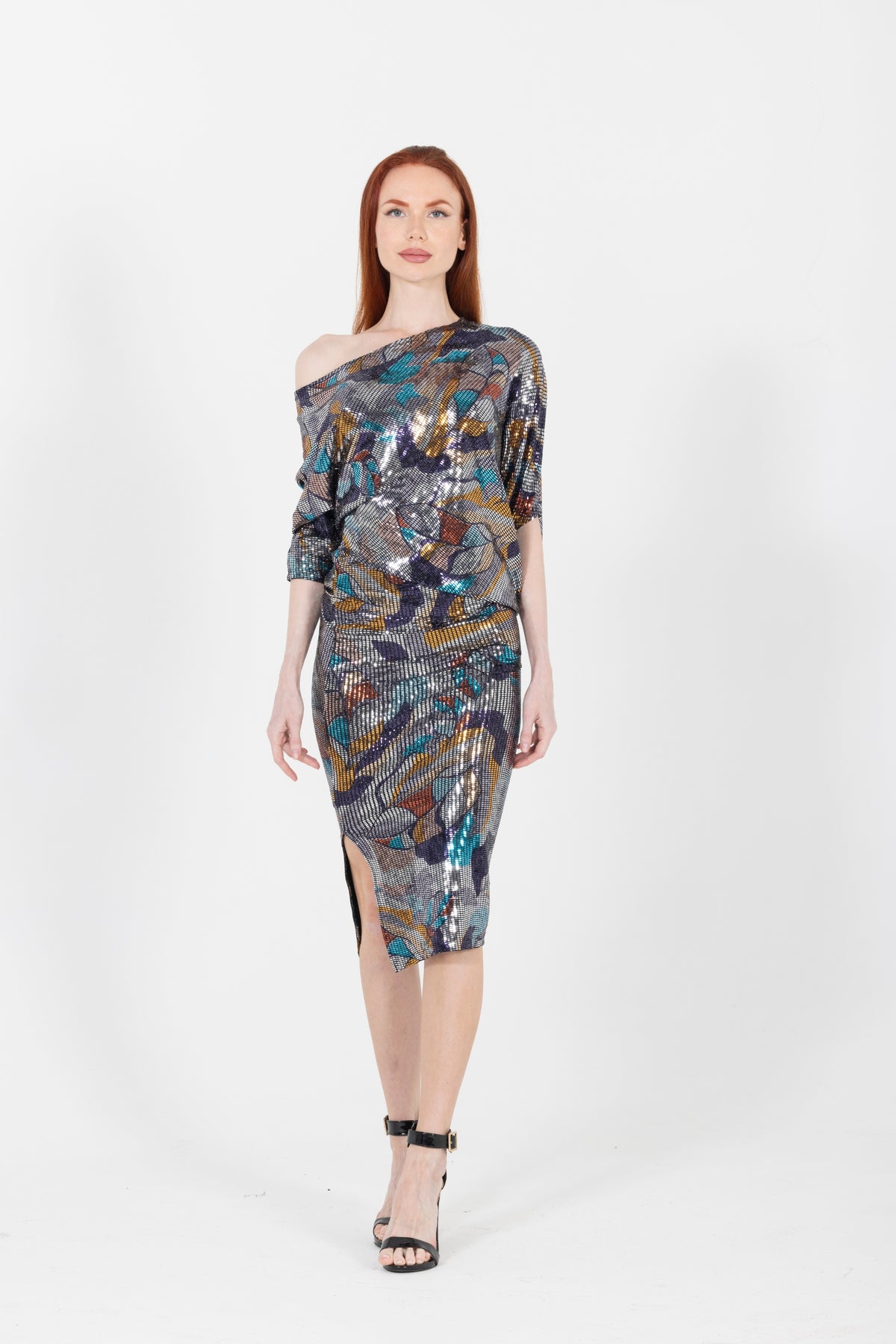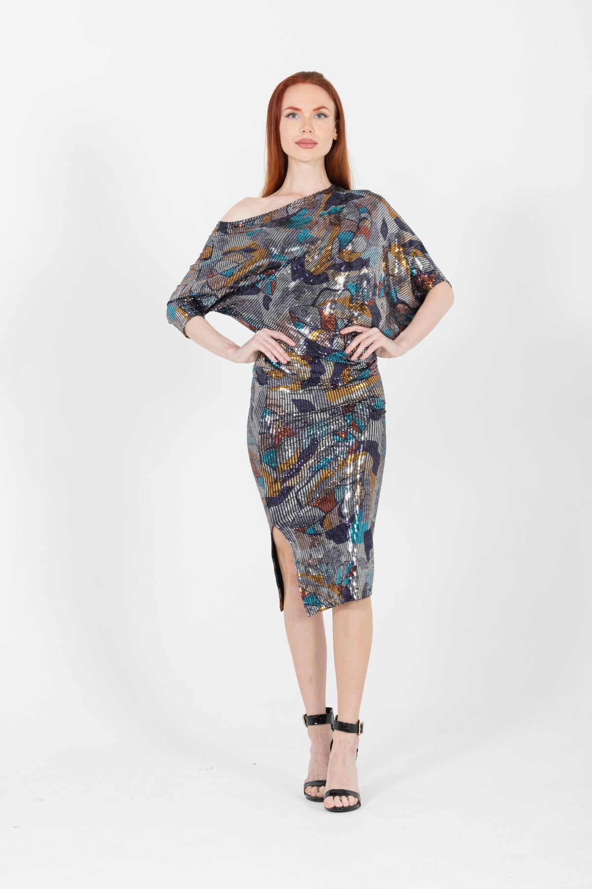 The Navi Dress in Celebration is a standout piece featuring a vibrant, artistic print and a flattering wrap-style fit. Designed for the woman who loves to make an entrance, this dress is ideal for holiday gatherings and special occasions.