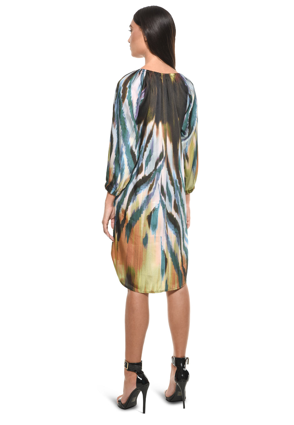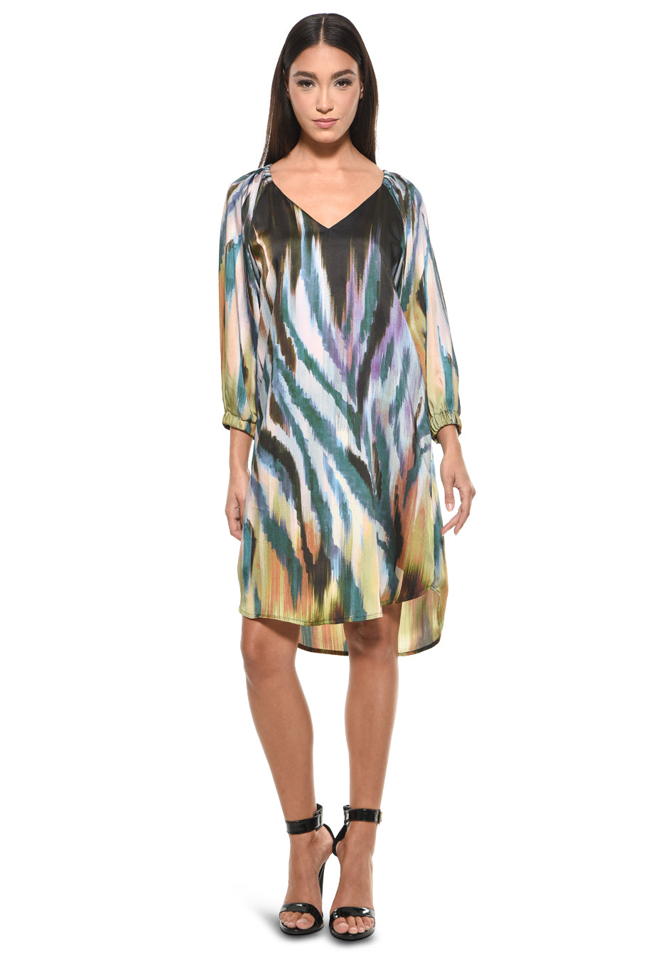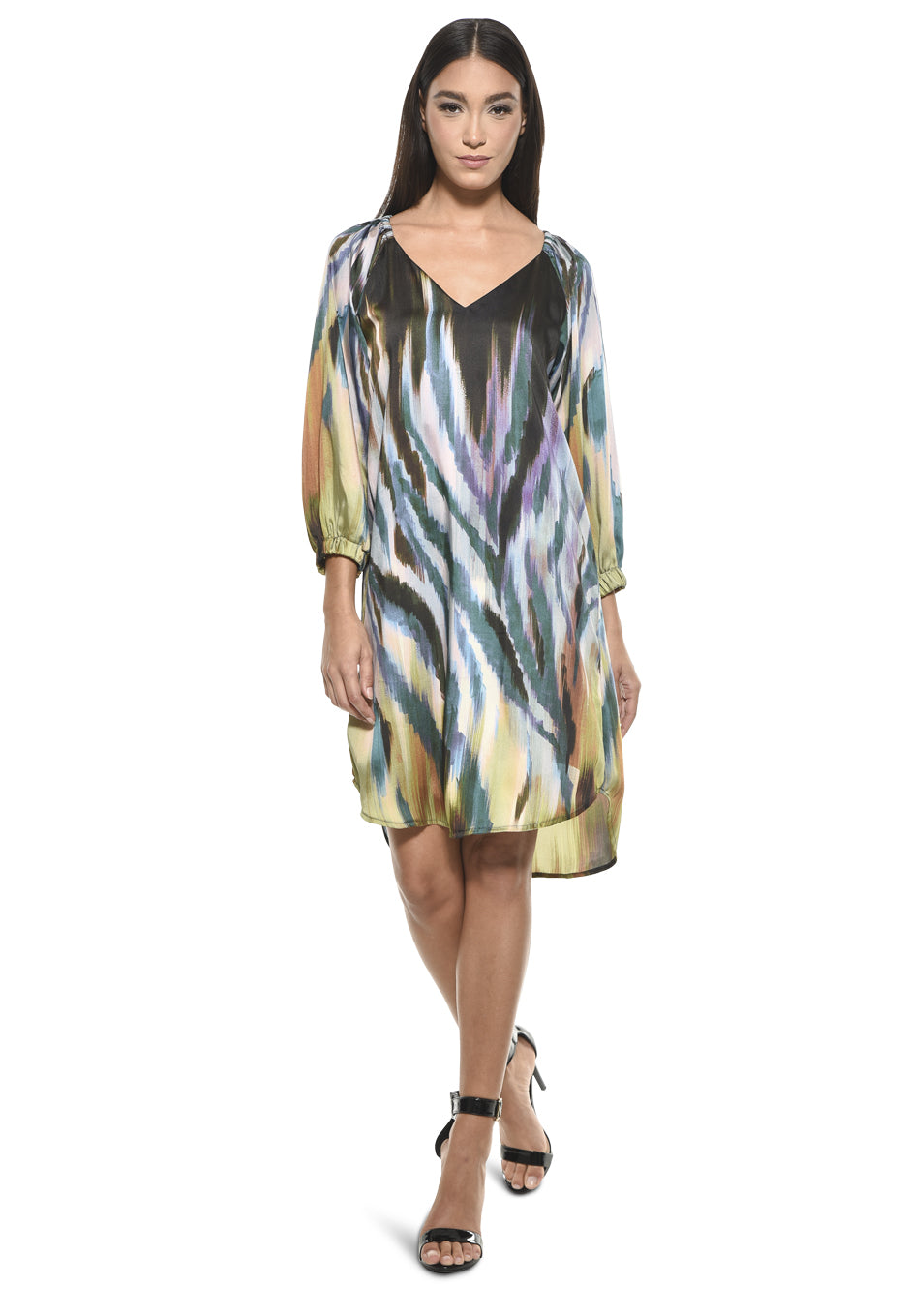 Unveil your bold side with the Victoria Dress in Africa Print by Julian Chang. This effortlessly chic dress features a mesmerizing abstract print that evokes the vibrant hues and patterns of African artistry. Its V-neckline and relaxed fit make it a comfortable yet stylish choice for any occasion. The flowing silhouette drapes beautifully, while the 3/4-length sleeves with subtle elastic cuffs add a touch of sophistication. Perfect for making a statement, whether at a casual outing or an evening event, the Victoria Dress brings Miami designer Julian Chang’s signature flair to your wardrobe.