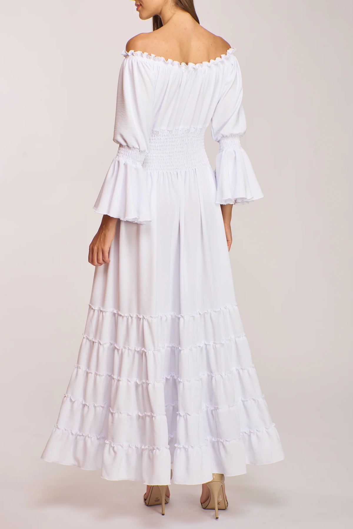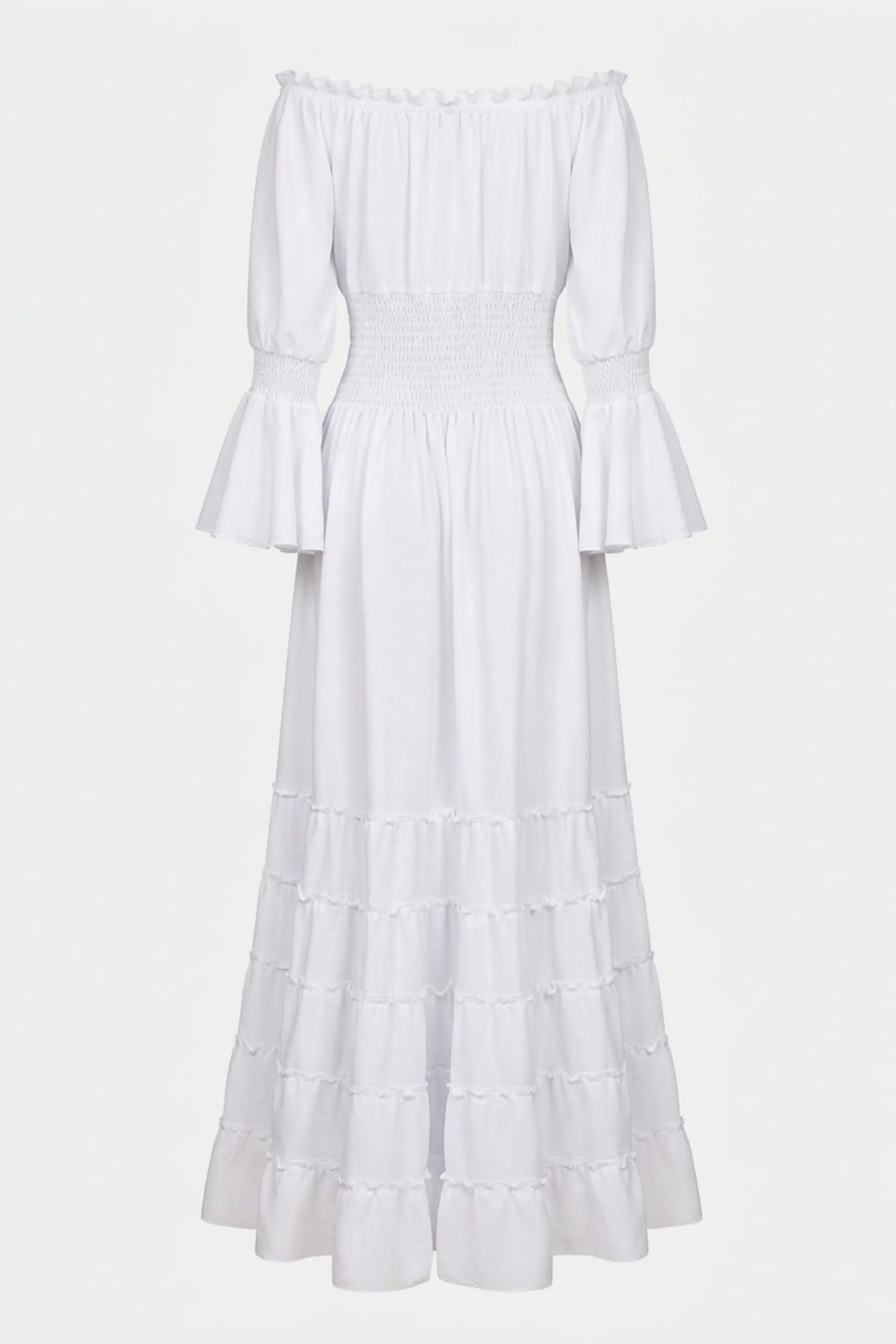 For the woman who wants presence without pretense, this silhouette delivers effortless elegance from neckline to hem. The off-shoulder smocked bodice offers secure stretch without squeezing, creating definition through the waist while flattering a fuller bust or straight torso. Billowed sleeves with flounced cuffs add movement, and the tiered maxi skirt invites a breezy sway with every step. Whether you’re heading to a resort dinner or summer gallery event, this piece is your one-and-done answer to warm-weather sophistication.