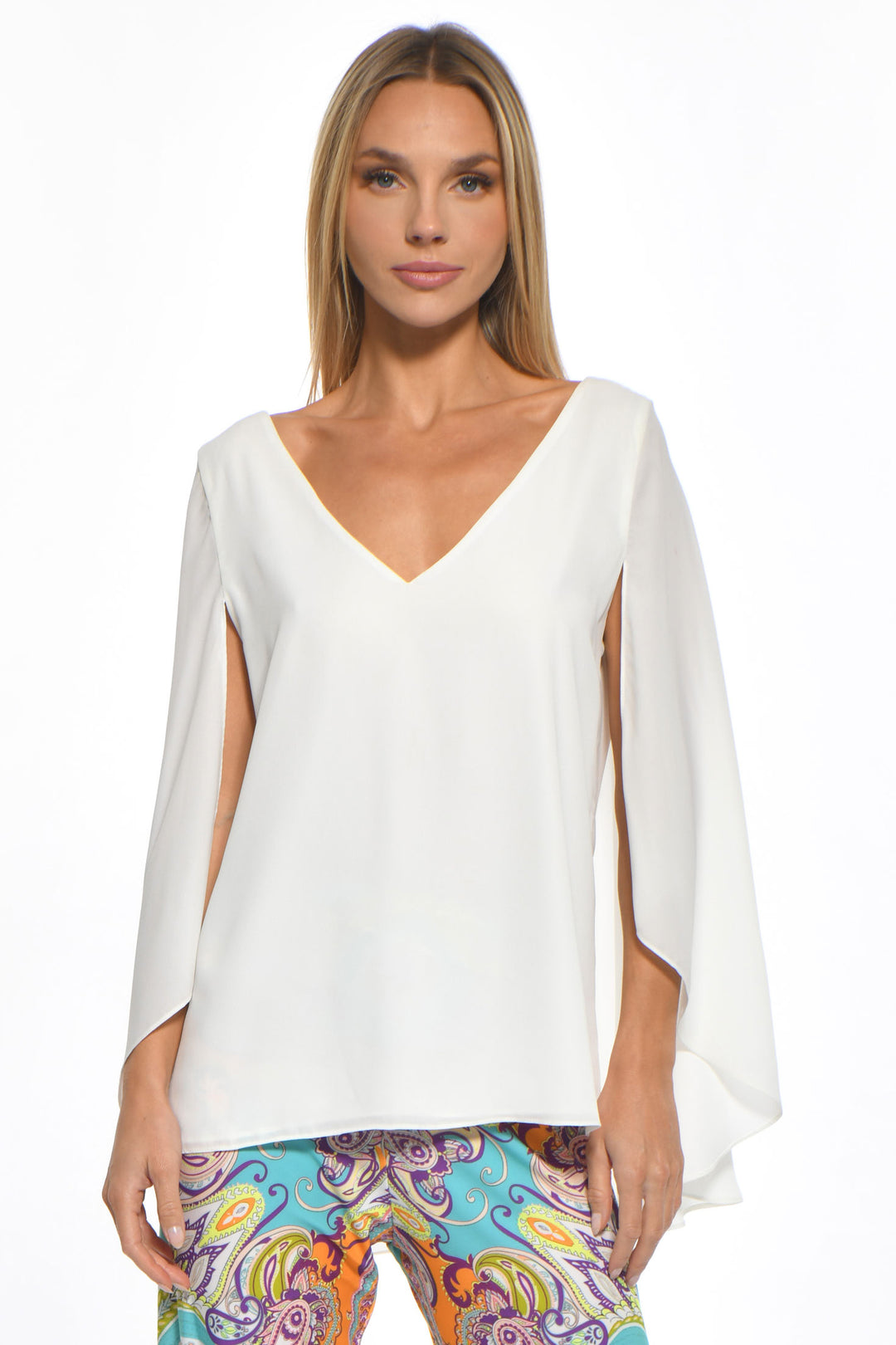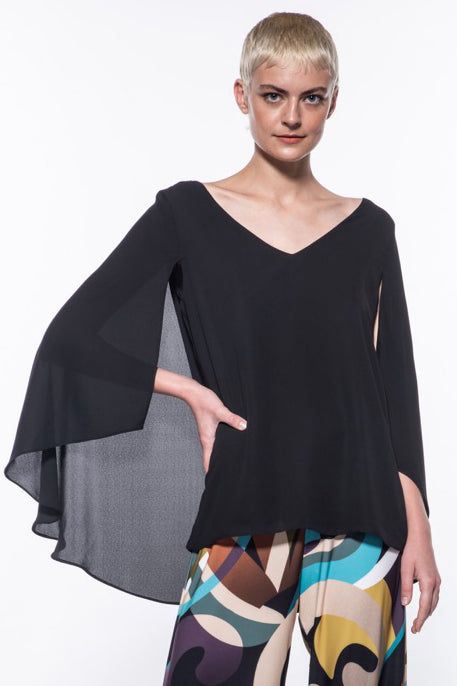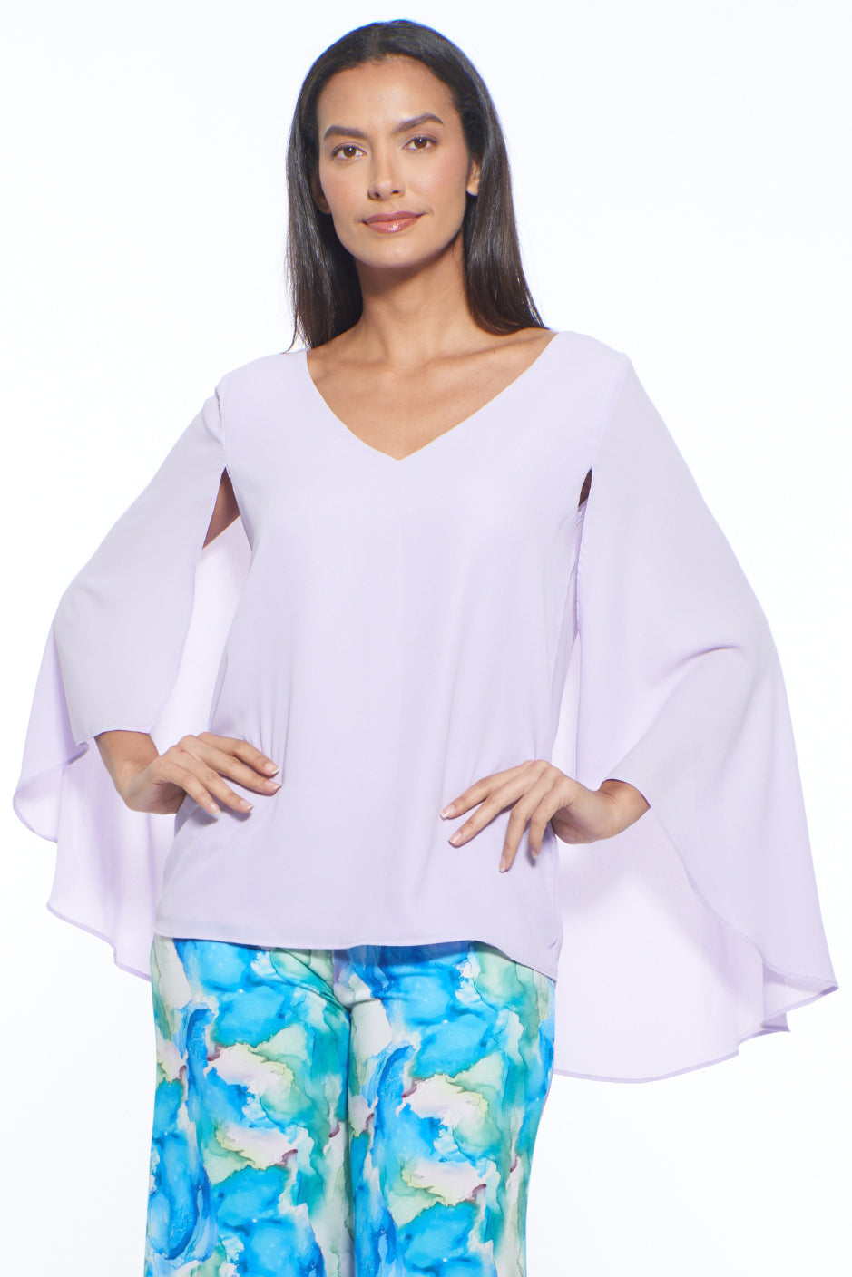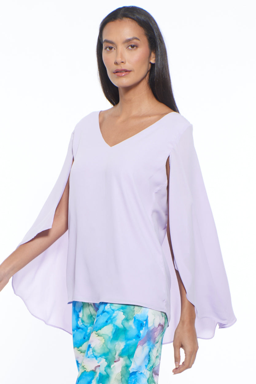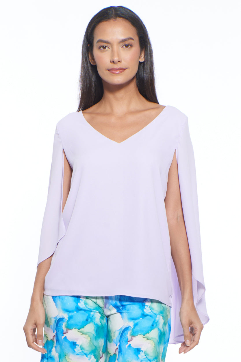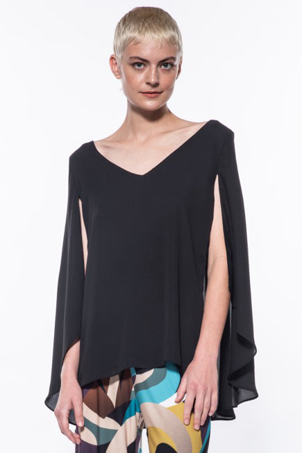 A refined statement in flow and femininity. Crafted from fluid stretch crepe, this silhouette features a relaxed V-neckline and open cape sleeves that cascade with elegant ease. The back hem offers subtle drama with a gentle high-low cut, making this top effortlessly flattering from every angle. Offered in soft neutrals and romantic pastels, it’s a wardrobe essential that transitions beautifully from boardroom to brunch.