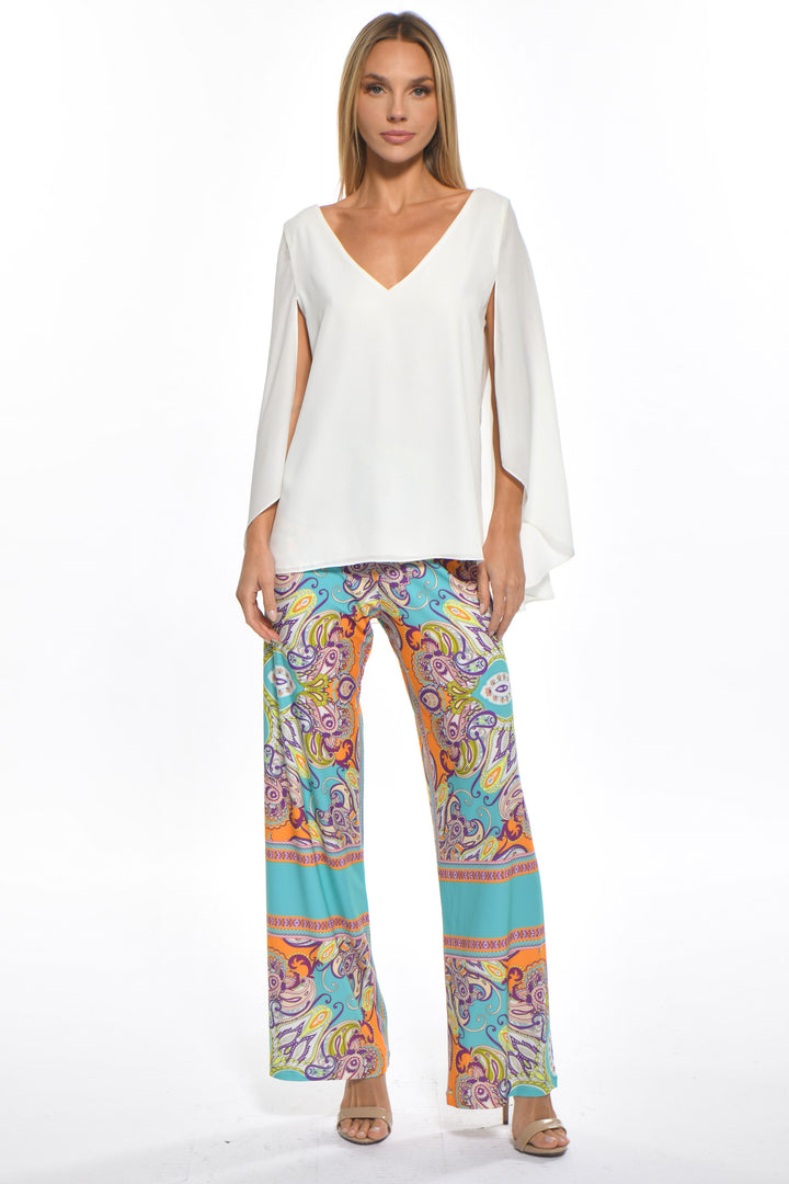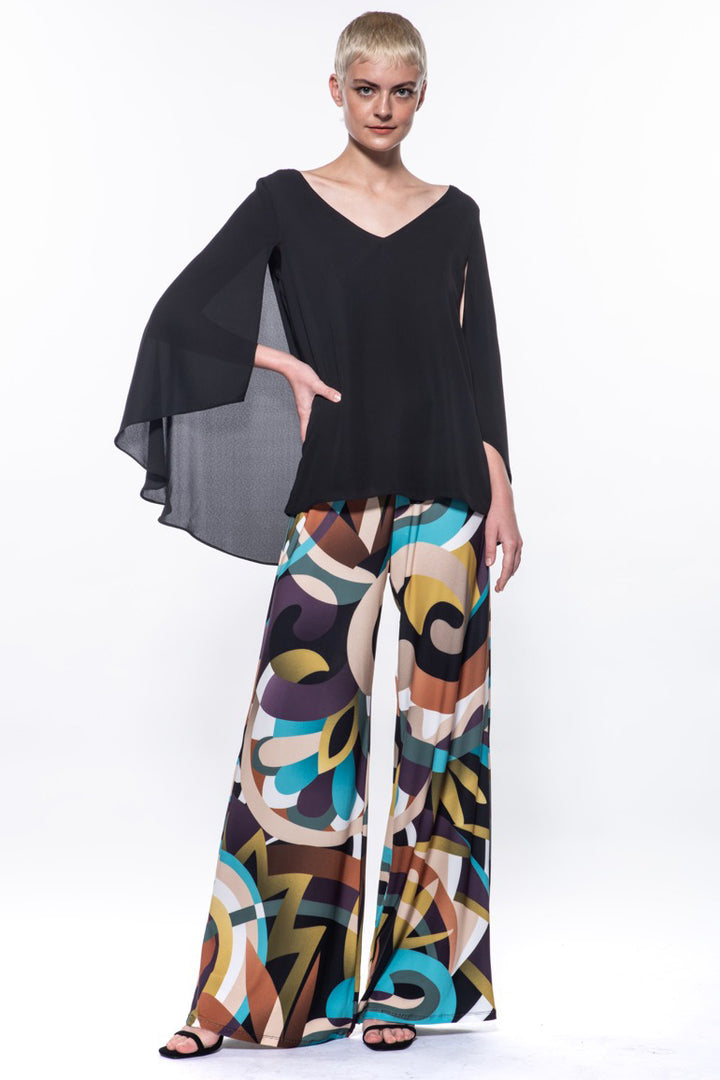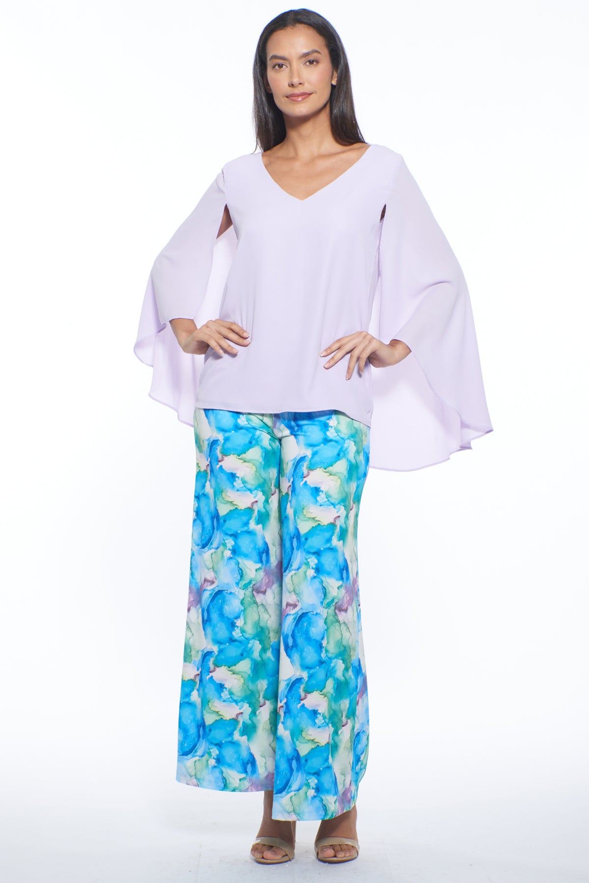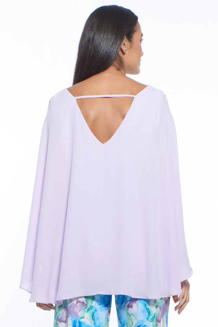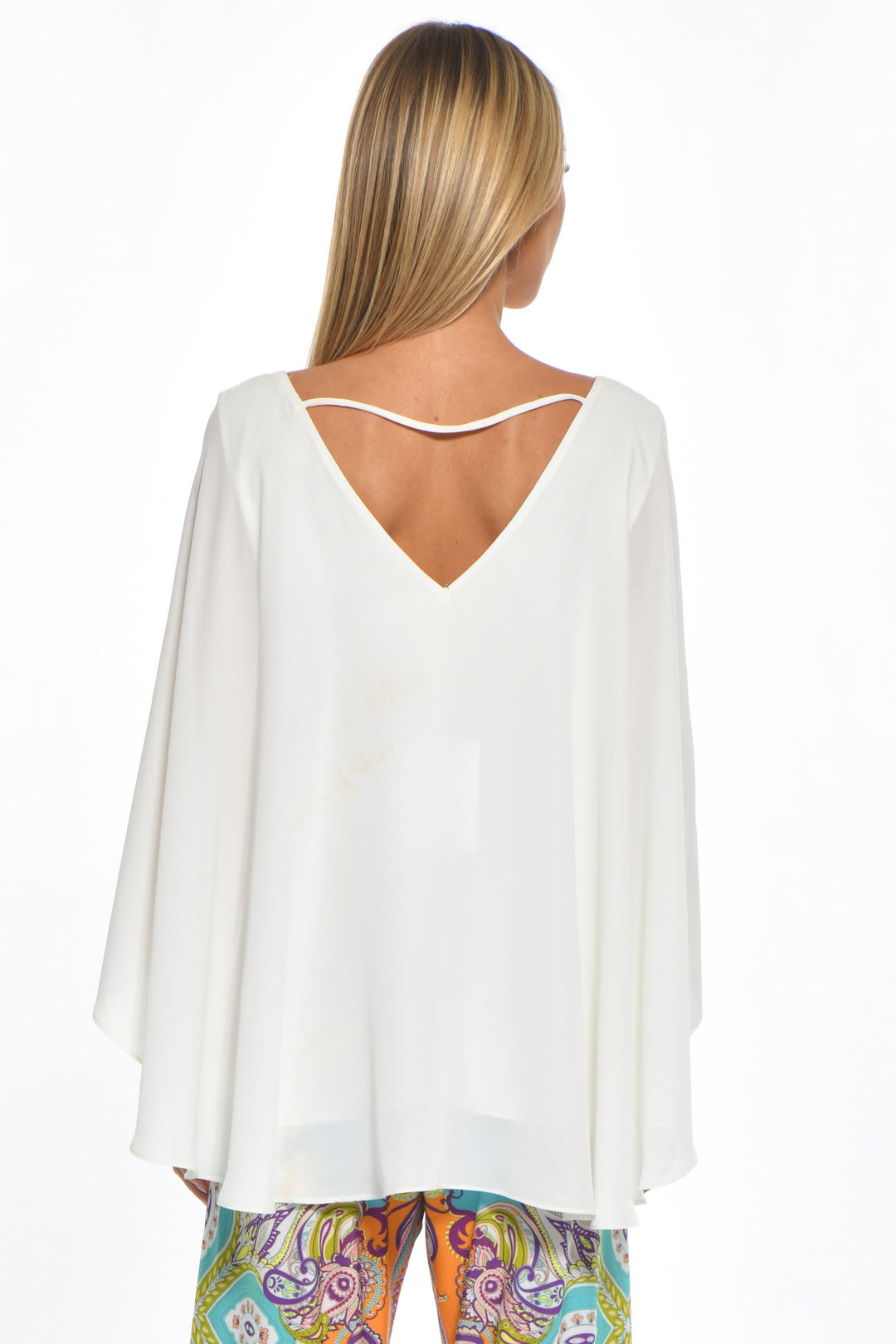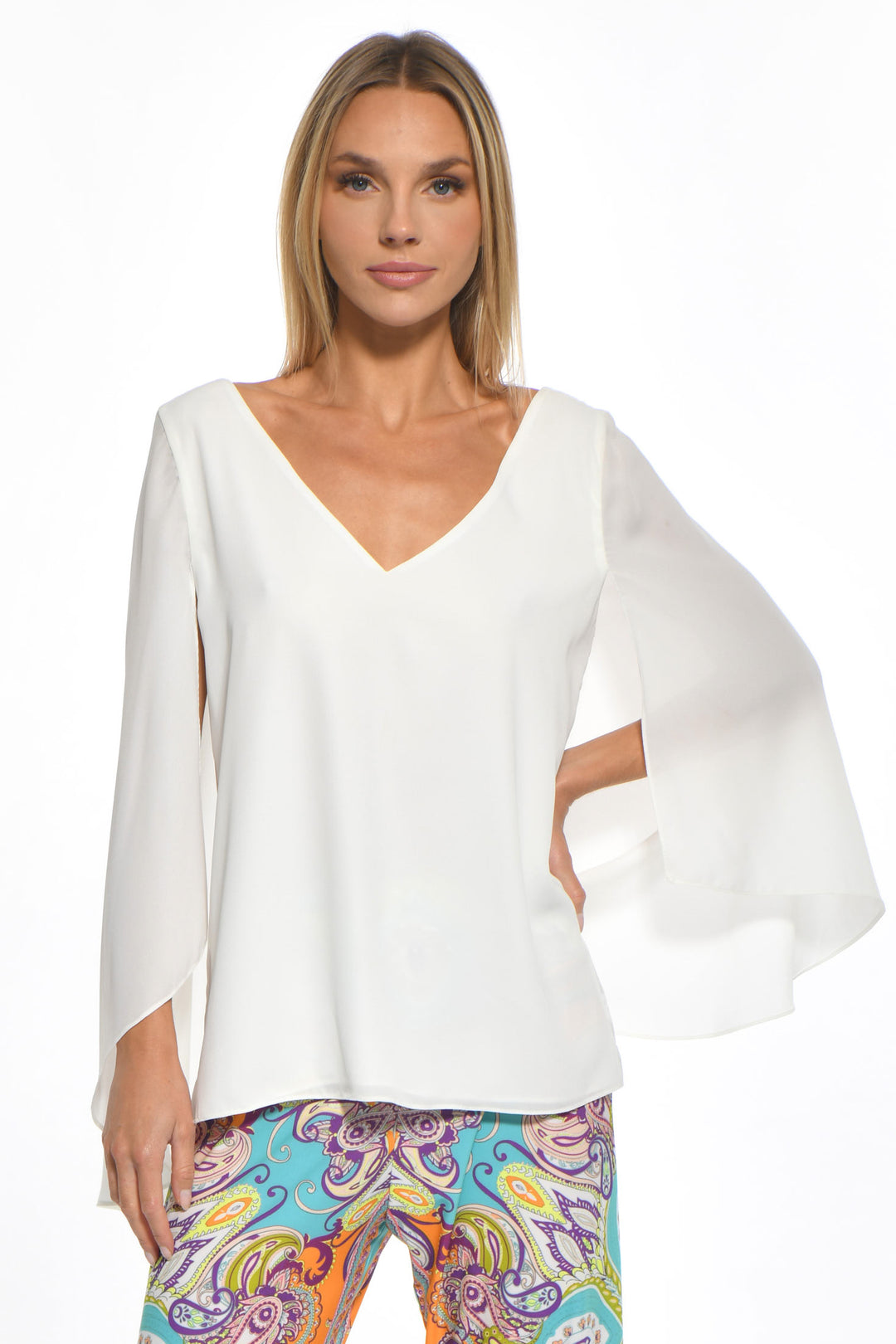 A refined statement in flow and femininity. Crafted from fluid stretch crepe, this silhouette features a relaxed V-neckline and open cape sleeves that cascade with elegant ease. The back hem offers subtle drama with a gentle high-low cut, making this top effortlessly flattering from every angle. Offered in soft neutrals and romantic pastels, it’s a wardrobe essential that transitions beautifully from boardroom to brunch.
