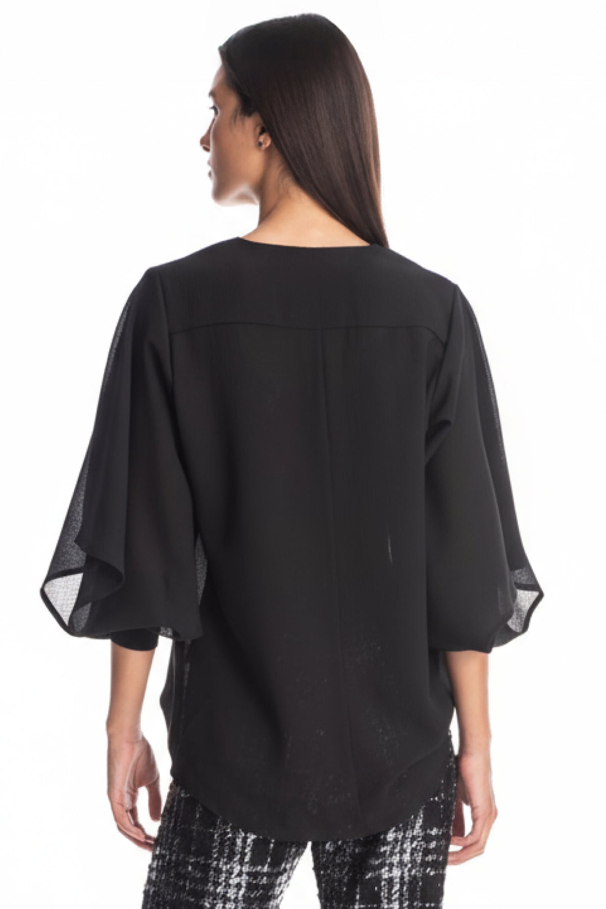 A sheer V-neck top that channels refined ease with a fluid silhouette and subtle drama. Crafted in a featherlight crepe with soft inner lining, it features ¾ bell sleeves that float with every move and a deep V-neckline that adds polish without effort. Whether paired with statement trousers for evening or worn with denim for weekend art walks, it’s an instant mood-lift in wardrobe form.