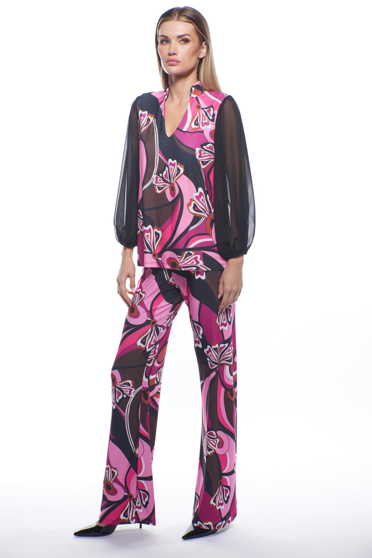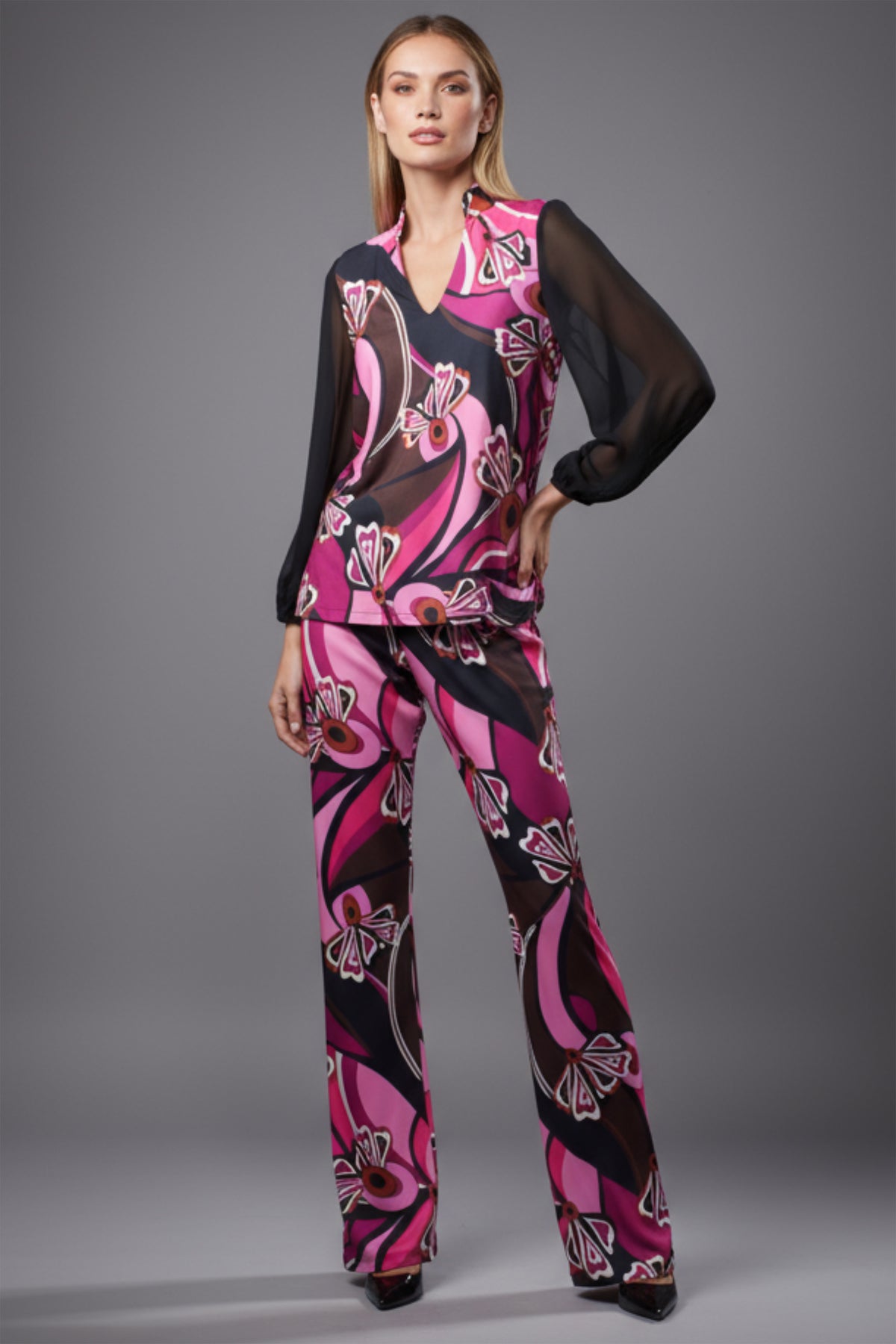 Bold expression with sheer sophistication. Crafted in airy chiffon with a luminous abstract print, it offers lightweight movement and subtle drama that feels effortlessly refined. The soft blouson silhouette flatters every shape and transitions beautifully from daytime gatherings to evening soirées.