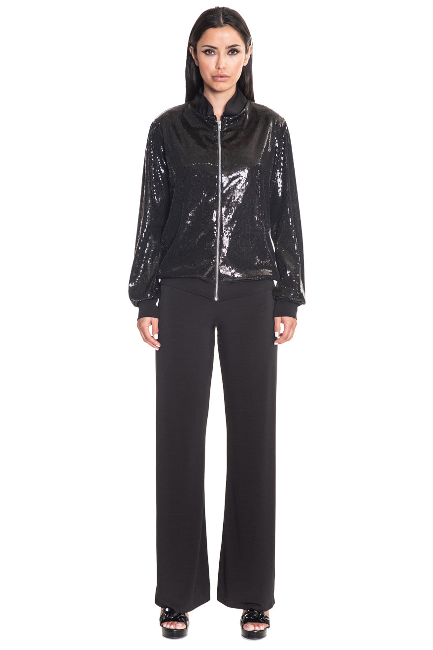 A sleek remix of classic streetwear, this zip-front bomber adds after-dark energy to everyday dressing. Fully embellished in jet-black sequins and framed with soft stretch cuffs, it balances bold shimmer with sport-luxe ease. Toss it on over a sleek jumpsuit or elevate your airport look—this jacket is built to travel, dazzle, and move with confidence.