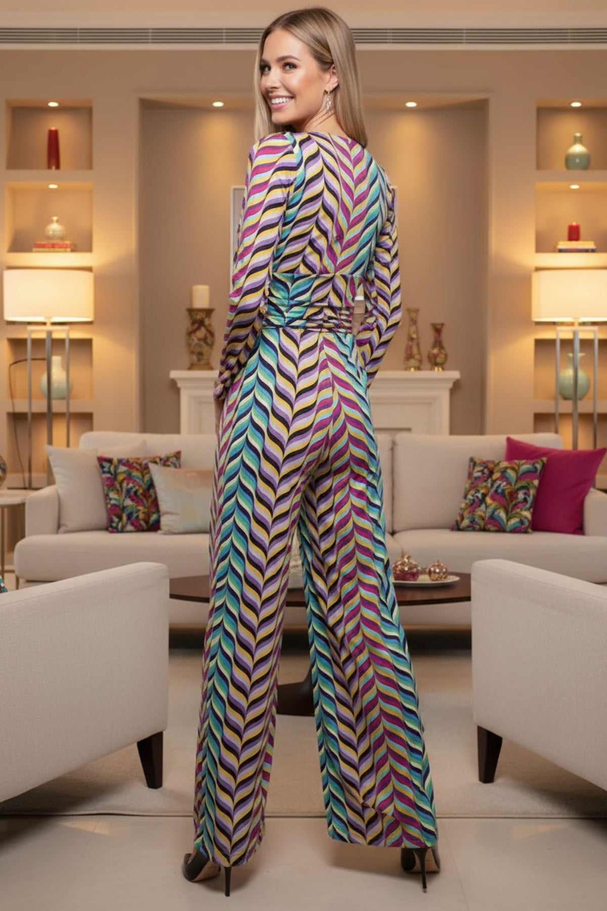 Playful yet refined, this statement silhouette radiates confidence in the bold Amigo print. A deep V-neckline and cinched waist create a flattering, elongating effect, while wide-leg pants add fluid movement and modern ease. Crafted from Julian Chang’s signature wrinkle-resistant stretch fabric, it travels beautifully and transitions effortlessly from daytime polish to evening allure.