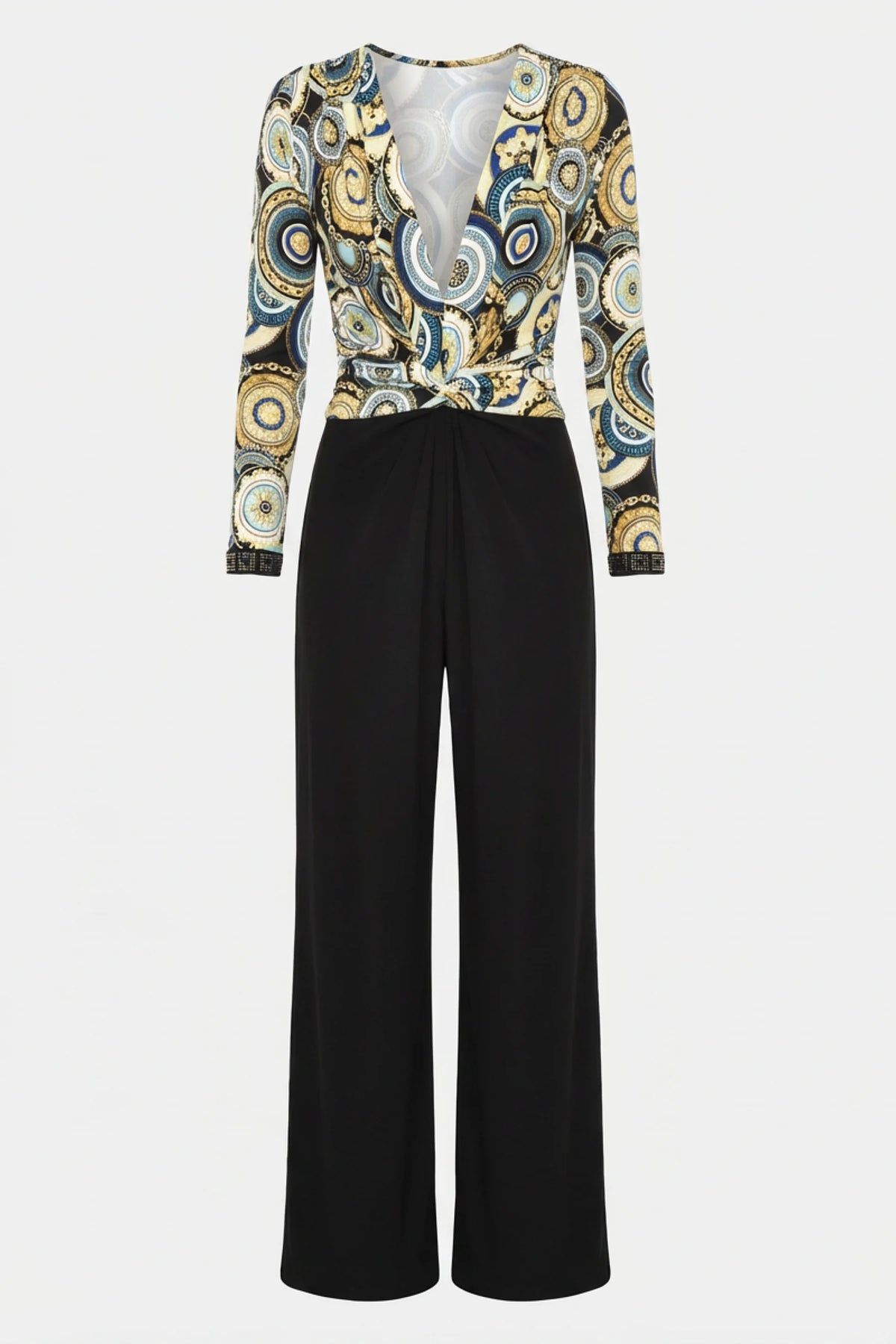 The Amber Mixed V-Neck Wide Leg Jumpsuit reimagines Julian’s signature silhouette with striking contrast and elevated ease. Featuring a plunging neckline, long sleeves, and fluid wide-leg pants, this piece sculpts the waist while delivering a confident, elongated line. The mixed-design bodice adds graphic interest and showcases Julian’s iconic print artistry without compromising the jumpsuit’s timeless sophistication. Ideal for gallery nights, cocktails, or destination dinners—where polish and presence are key.