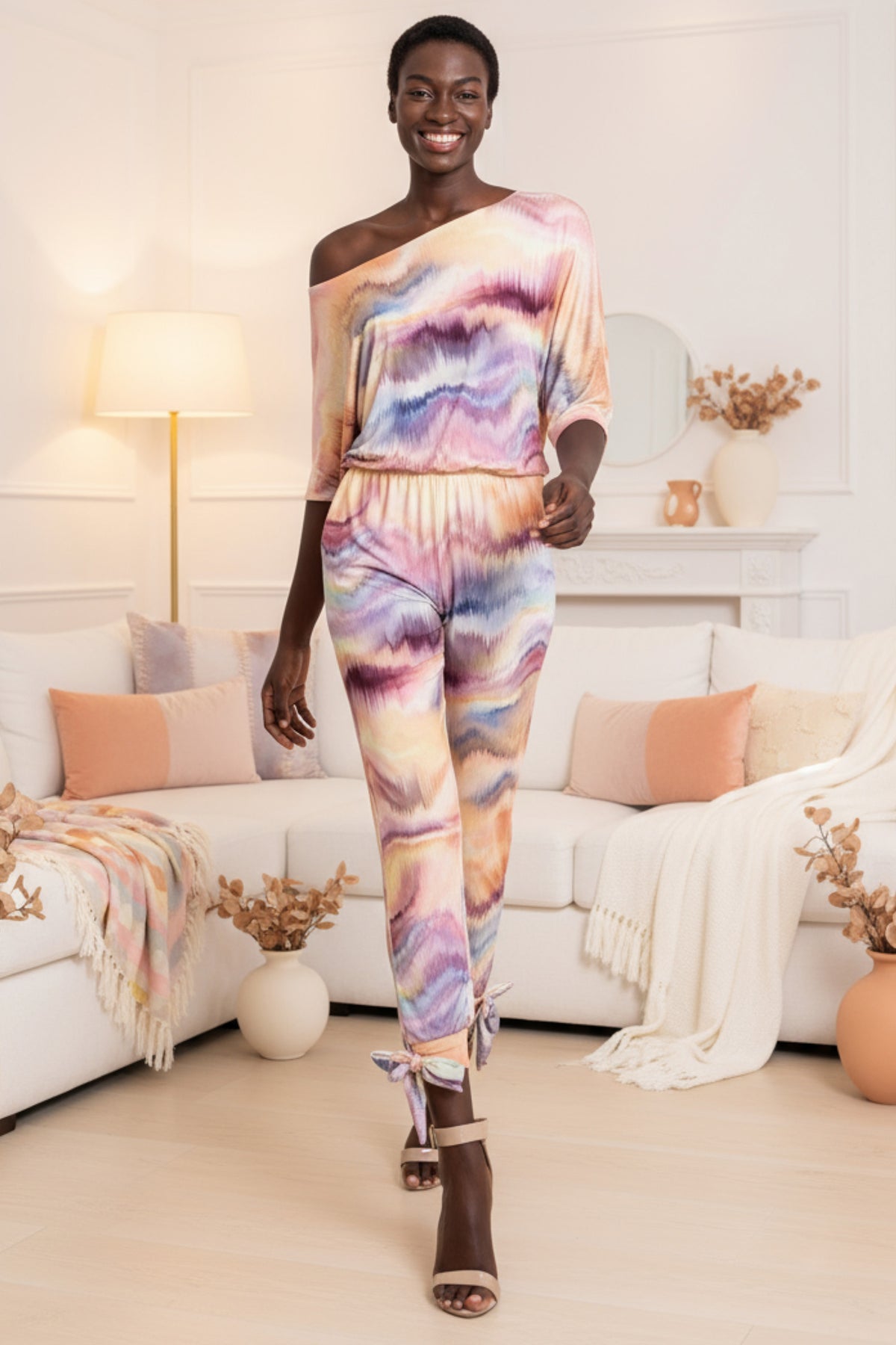 Easygoing yet bold, this off-the-shoulder jumpsuit brings a sun-soaked spirit to everyday style. A vibrant tie-dye print meets soft stretch fabric for all-day comfort, while cropped sleeves and tapered legs keep the silhouette sleek. With knotted hems and a flirty draped neckline, it's your go-to for lounging with edge or stepping out in style.