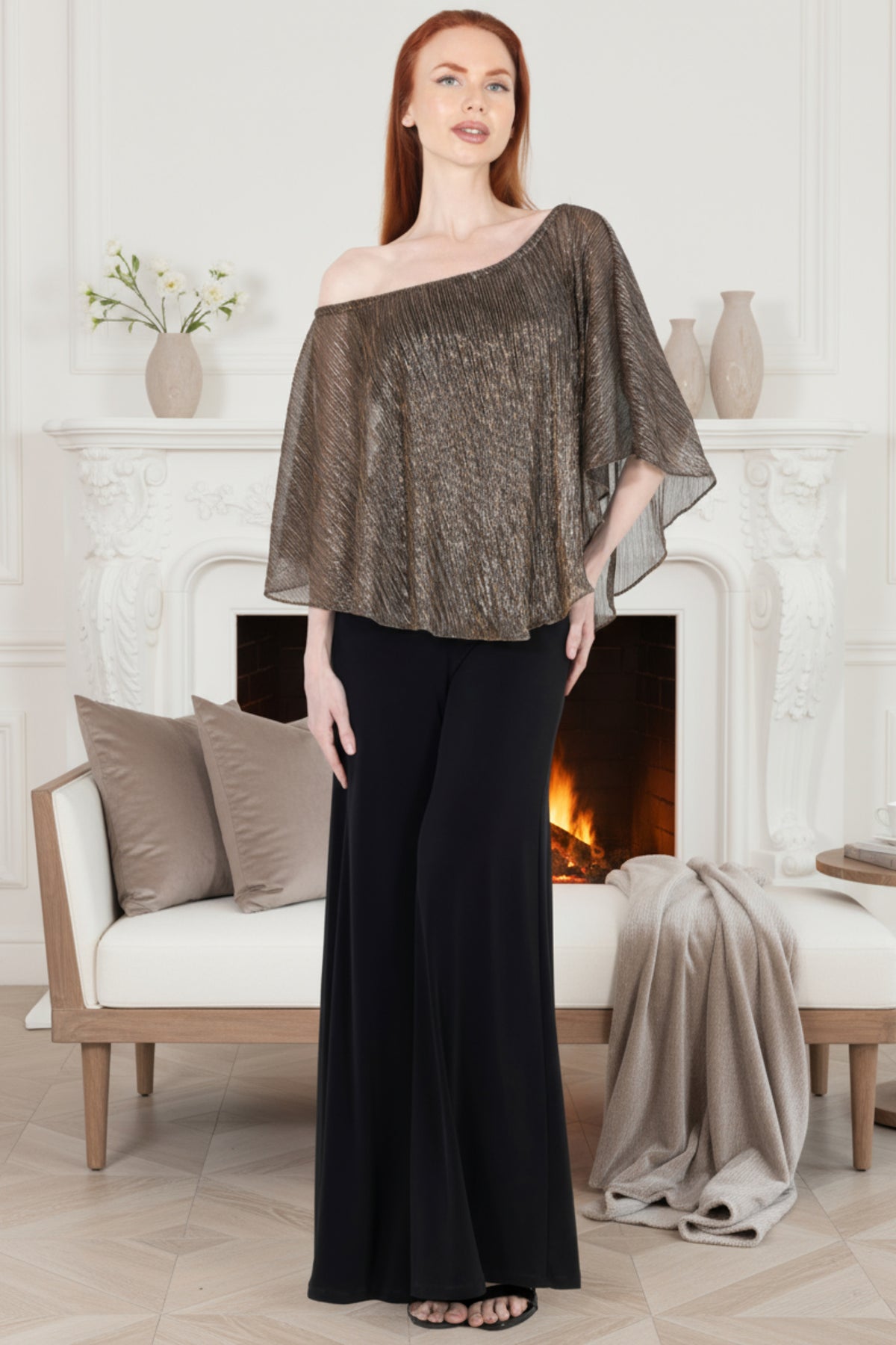 Holiday elegance redefined. Draped in a luminous, pleated metallic knit and paired with fluid black wide-leg pants, it moves like liquid light. The convertible neckline—worn asymmetrically or with a coordinating scarf—adds styling versatility, making it a statement for galas, cocktail parties, or winter escapes.