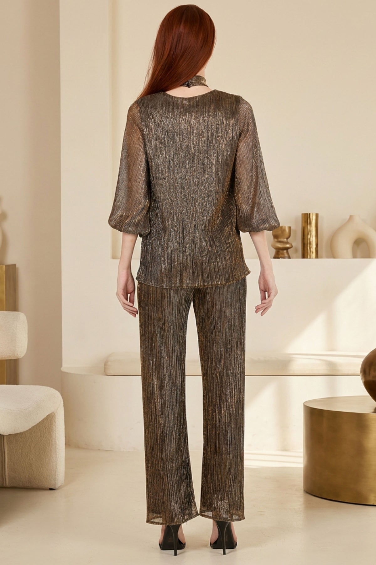 This silhouette solves the need for an evening-ready pant that delivers polish without sacrificing comfort. The fluid, straight-leg cut elongates the frame, while the metallic pleated fabric glides over the body with forgiving ease—ideal for women who want shimmer without cling. The lightweight drape makes it a natural choice for long dinners, festive gatherings, or a holiday escape. Pair it with the coordinating top for a luminous set or anchor it with a sleek black camisole for understated glamour.