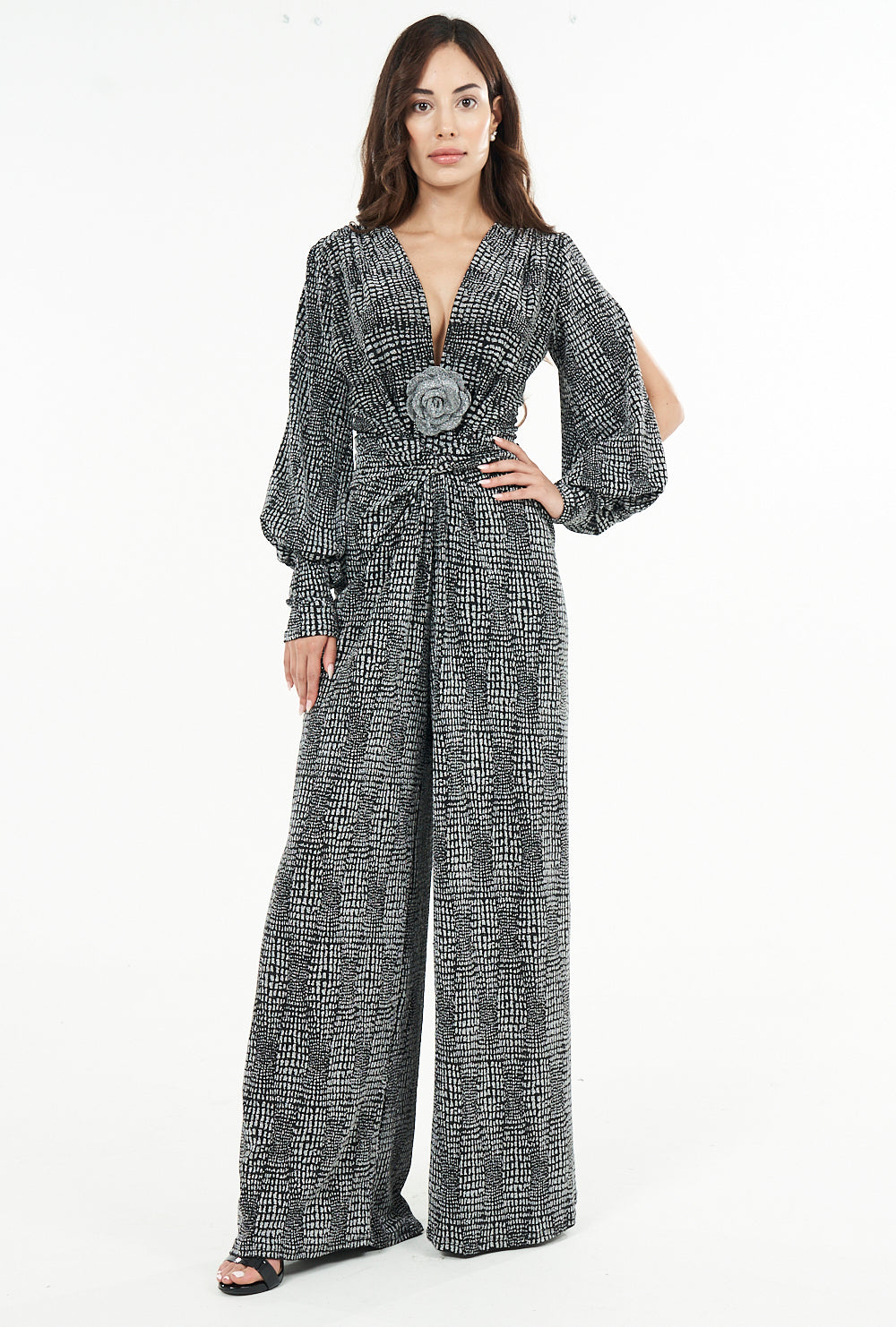 Made to mesmerize, this statement jumpsuit commands attention with every step. The shimmering silver snake print and plunging neckline set the tone, while a gathered waist crowned by a dramatic rosette sculpts the silhouette. Finished with voluminous balloon sleeves and crafted in wrinkle-resistant fabric, it's glamour that packs light and moves with ease.