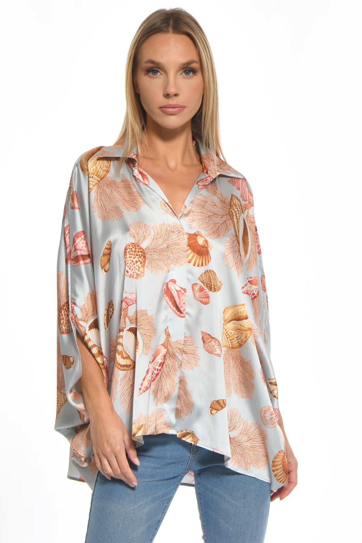 A breezy ode to oceanic elegance, this relaxed-fit tunic features a flowing silhouette, a structured open collar, and dolman-style sleeves with split detailing for added movement. The Sea Shell print captures coral reefs and shell motifs in sun-washed tones against a soft aqua base, evoking the serenity of coastal escapes. Crafted in lightweight, silky rayon, it drapes with ease and pairs effortlessly with denim or tailored pants.