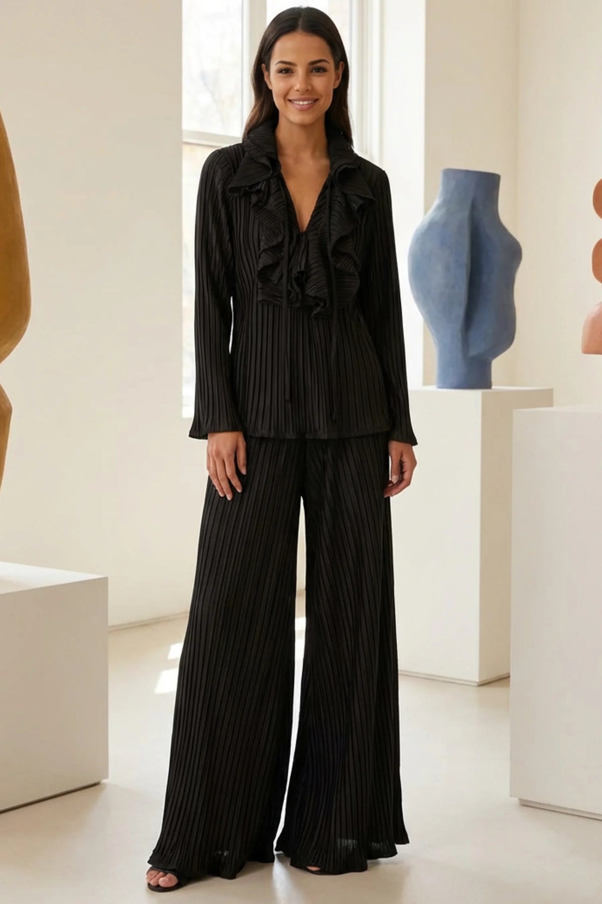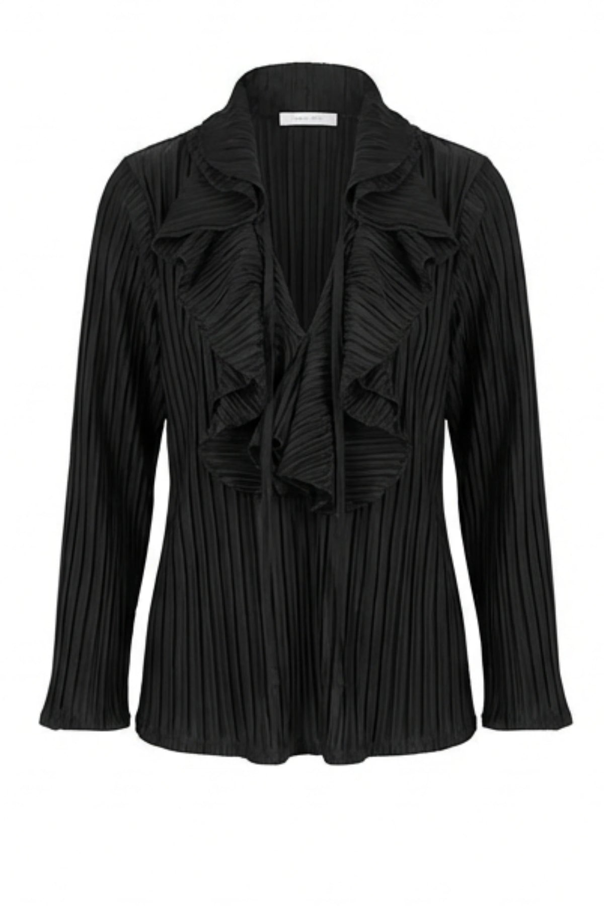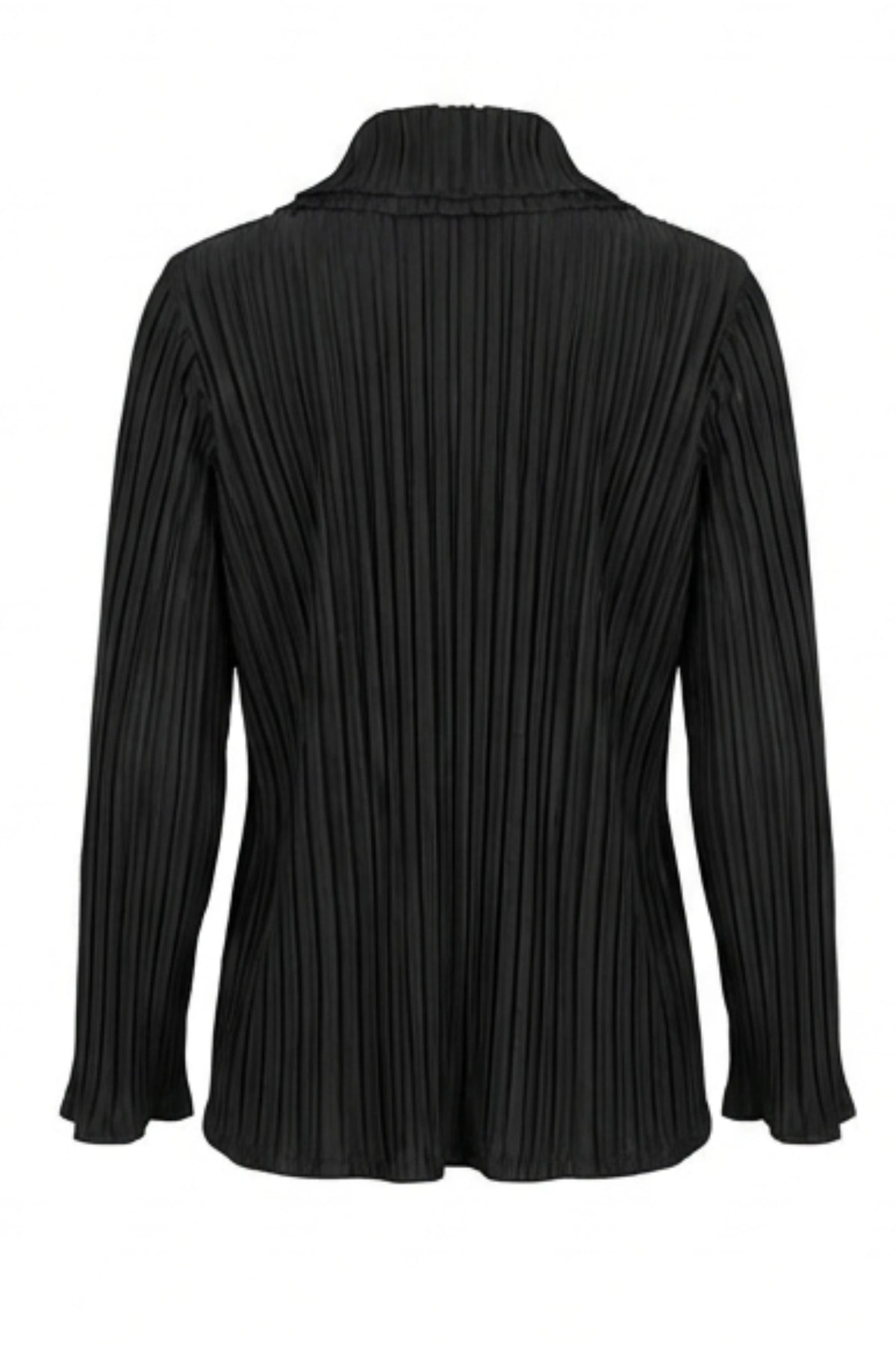 A wardrobe chameleon, sculpted for day-to-dusk versatility. Cut from a lightweight, stretch-infused fabric, its softly ruffled neckline frames the face while slim-cut sleeves balance the silhouette. Black-on-black pinstripes lend polish and subtle texture, making it ideal for work dinners, rooftop cocktails, or layered under statement prints. Travel-friendly and mood-lifting, it’s chic on its own and luminous in a layered look.