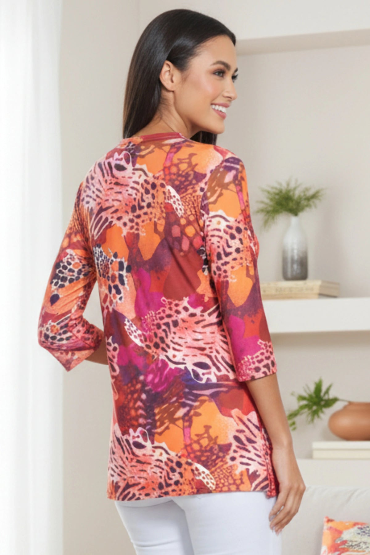 A bold twist on classic polish, this V-neck blouse energizes the everyday with vivid color and refined ease. The Wild print—a dynamic fusion of coral, flame, and hibiscus—commands attention without overpowering. Featuring a soft collar, three-quarter sleeves, and a gently flared hemline, it’s cut to flatter and built to move. Wrinkle-resistant with stretch for comfort, it’s your go-to for boardroom brunches or impromptu escapes.