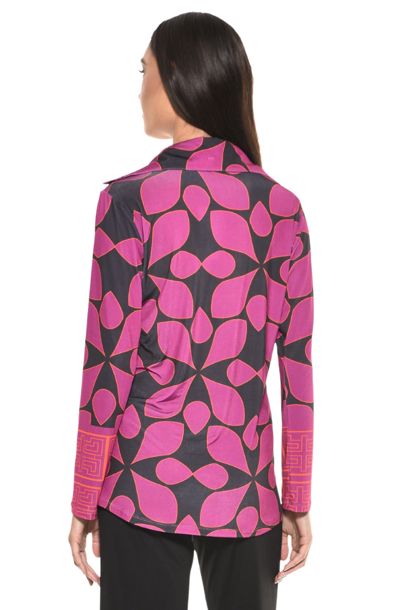 Command the moment in a blouse that makes Liverpool’s signature print the star. Sculpted with a collared neckline and subtle shoulder shaping, this statement top balances architectural elegance with fluid ease. The vivid pattern evokes city lights on satin—bold yet wearable, perfect for gallery nights, power lunches, or rooftop cocktails. Cut from wrinkle-friendly fabric, it’s a polished companion for women who lead with style and presence.