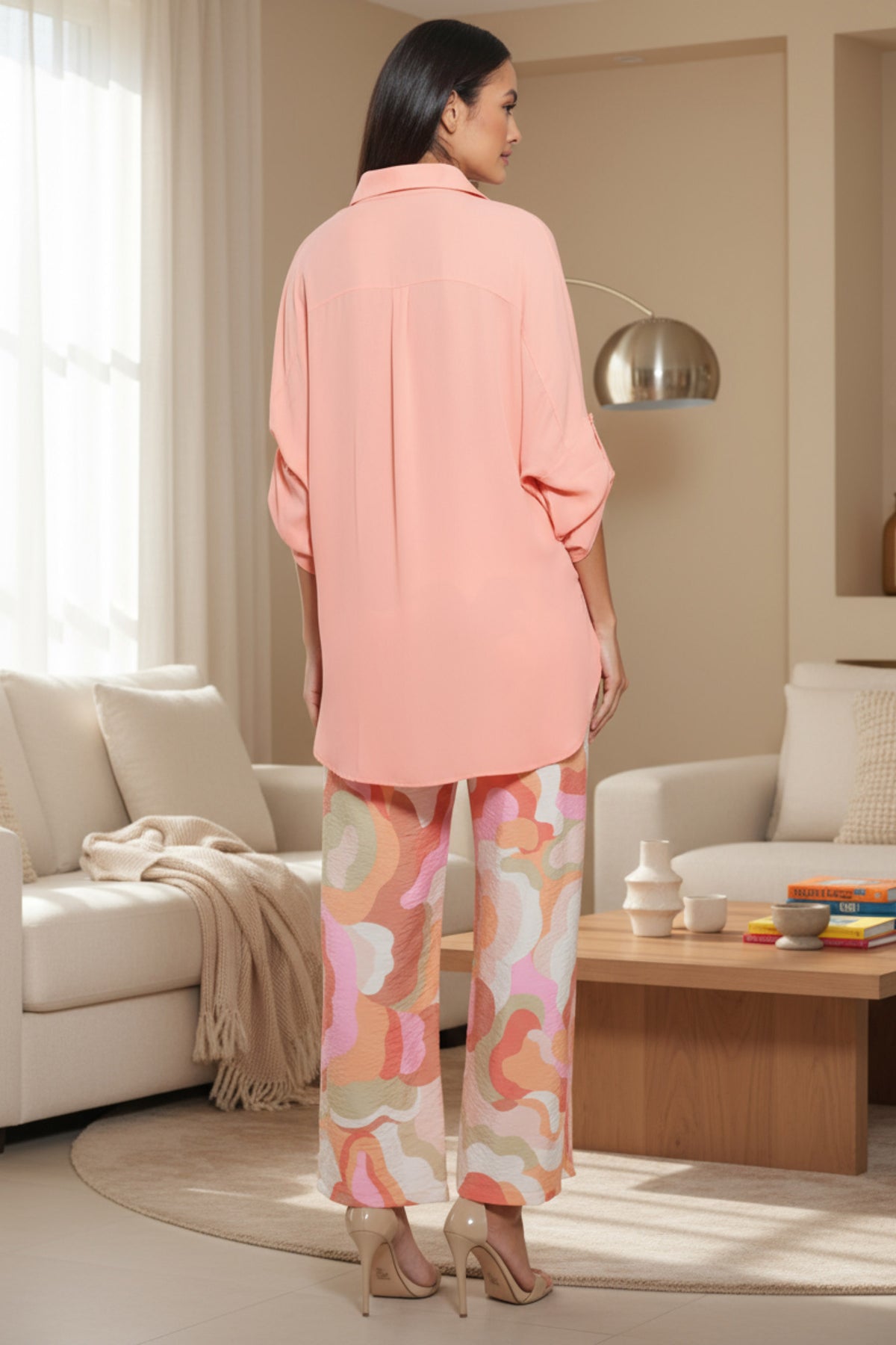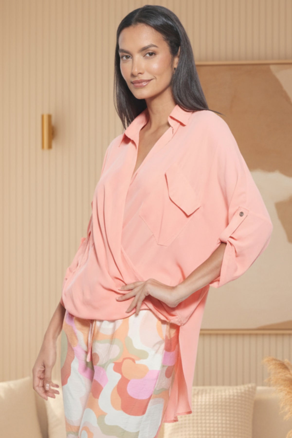 Soft yet structured, this draped blouse offers a fluid silhouette with just the right amount of polish. A relaxed collar and crossover front create a flattering V-neckline, while the asymmetric hem floats gently over the hips for graceful movement. Ideal for both travel and transitions—it’s the go-to piece that always says effortless glamour.