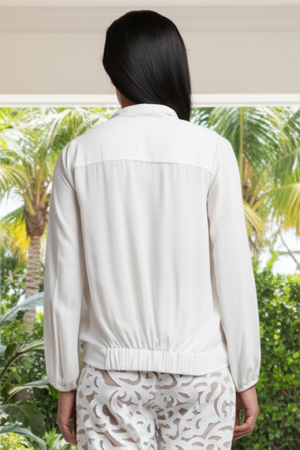 Effortless sophistication with a fluid drape and universally flattering silhouette. Designed in airy stretch georgette, it features a softly pleated crossover neckline, full-length sleeve, and a gentle elastic back hem for ease of wear. Ideal for office meetings, gallery strolls, or evening dinners, this timeless piece pairs beautifully with both tailored trousers and bold printed pants.