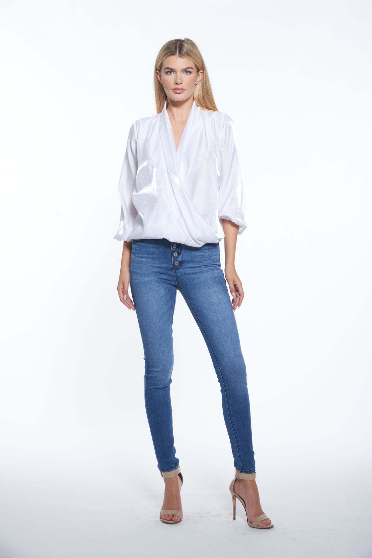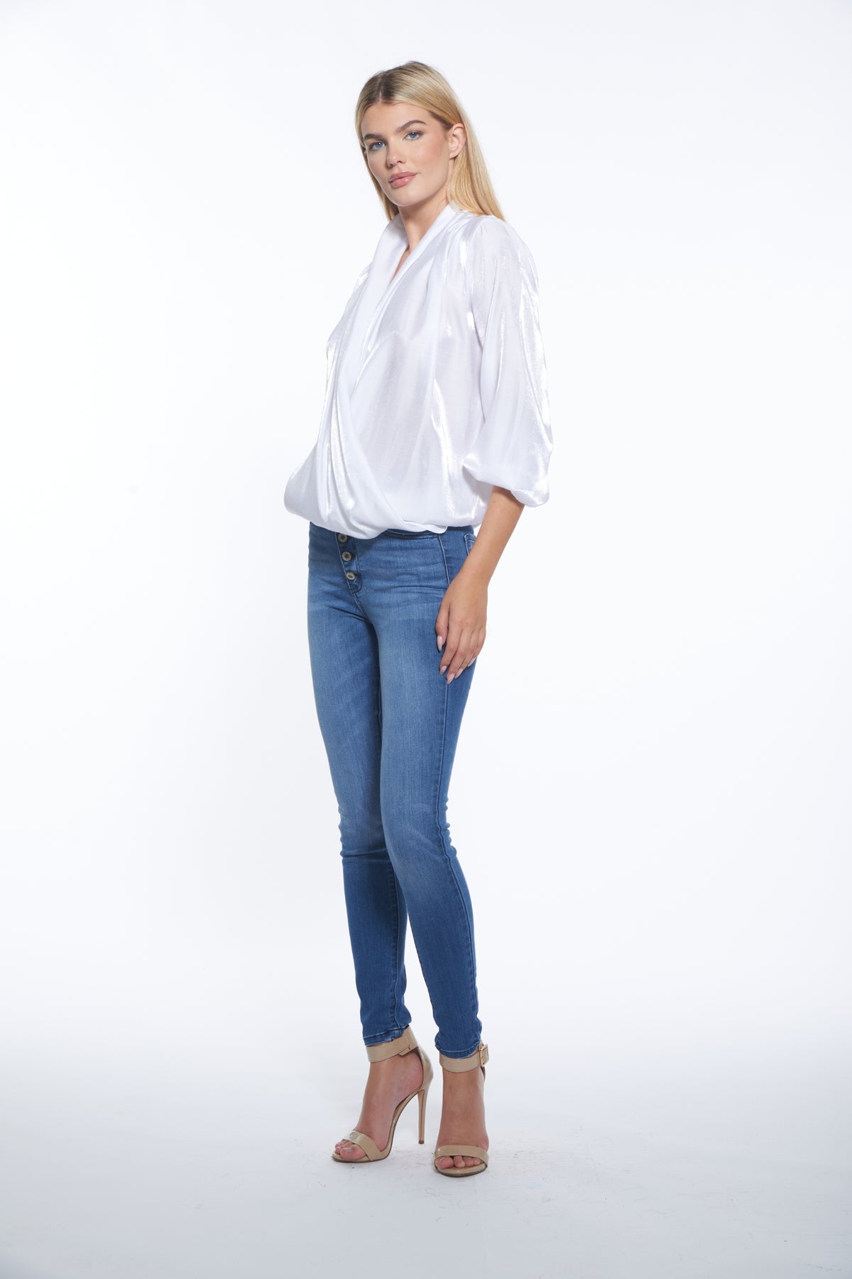The Punch Top in White is a sleek, gathered blouse with a front-tie waist and elegant collar. Pair it with jeans or statement pants for a polished finish.