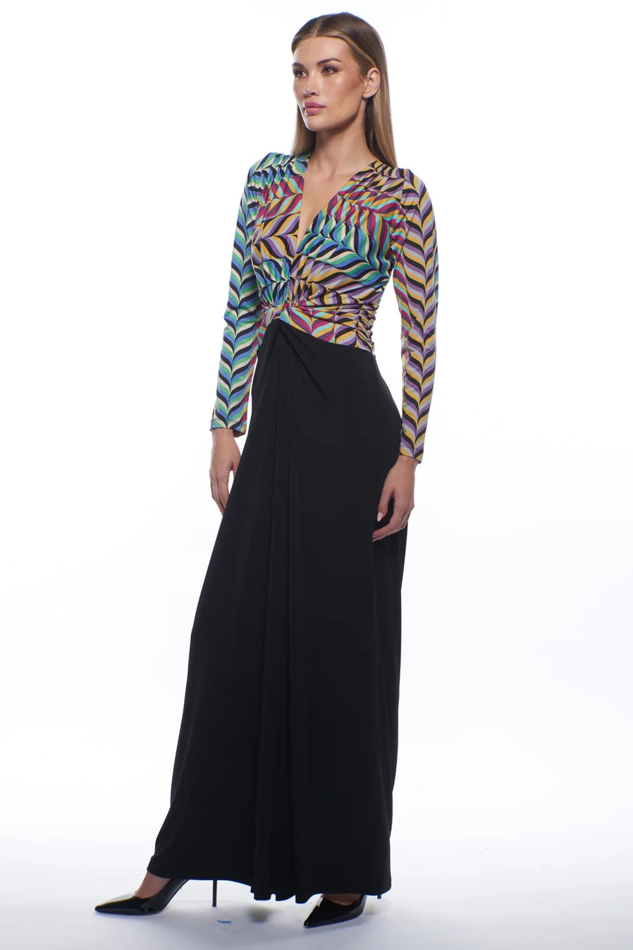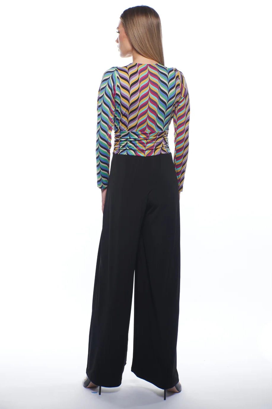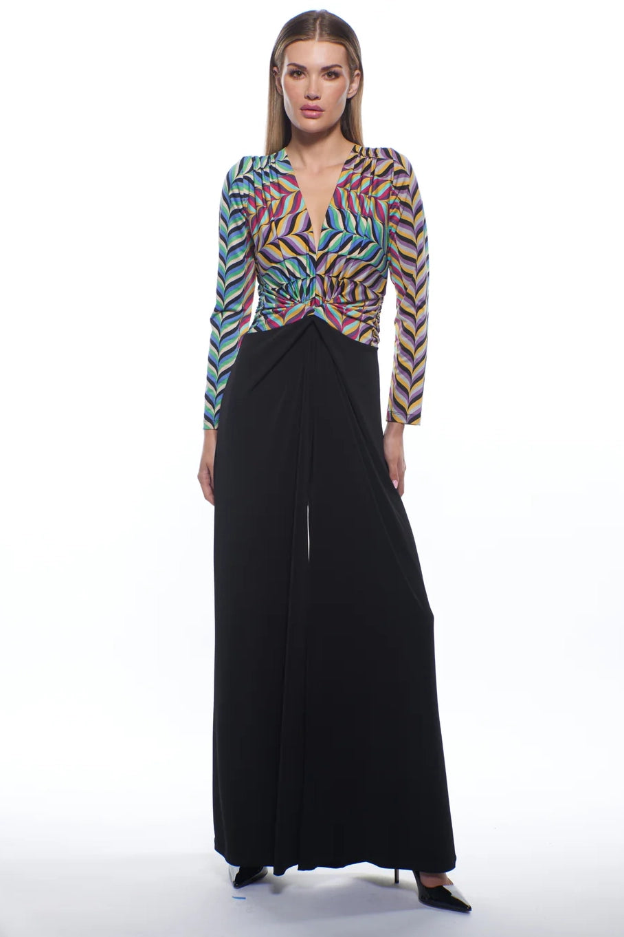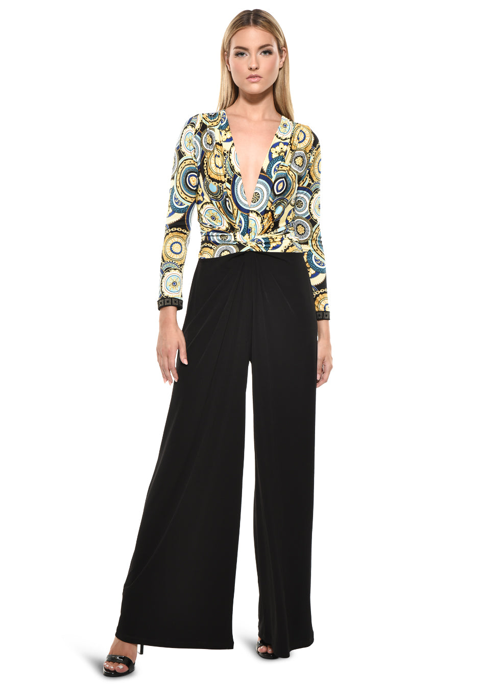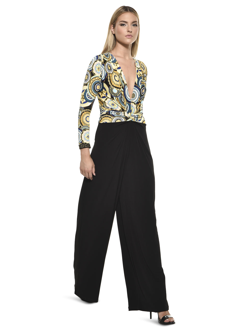 Model wearing Julian Chang Amber Jumpsuit in Contrast/Versus print, featuring a plunging V-neckline, long sleeves, and black draped pants