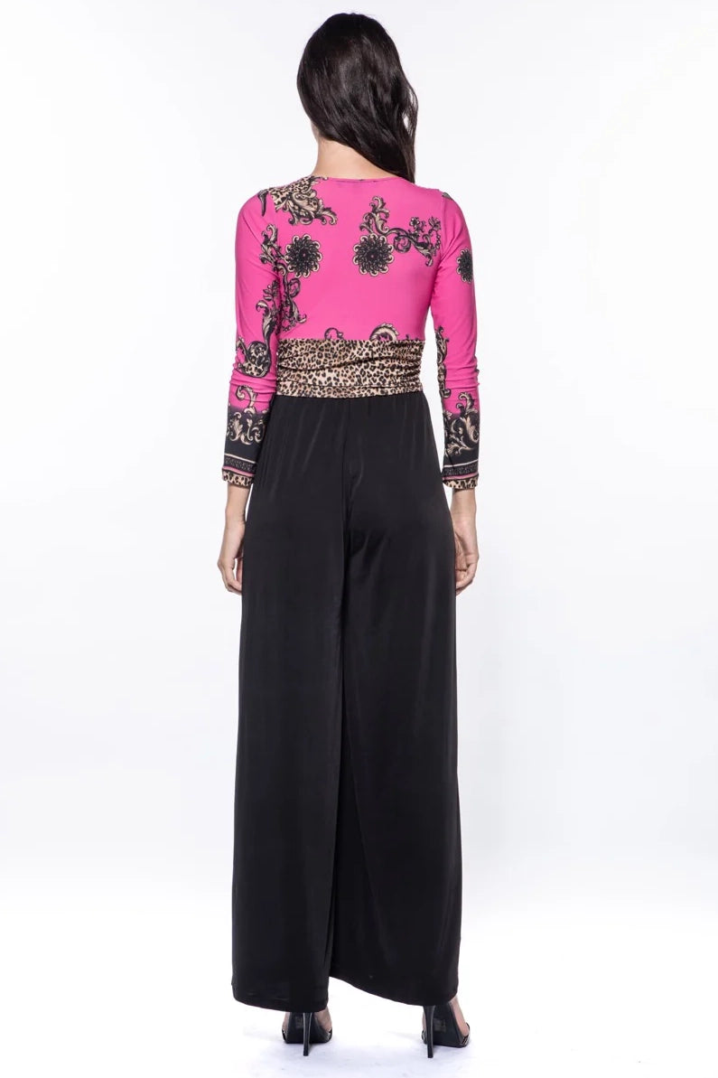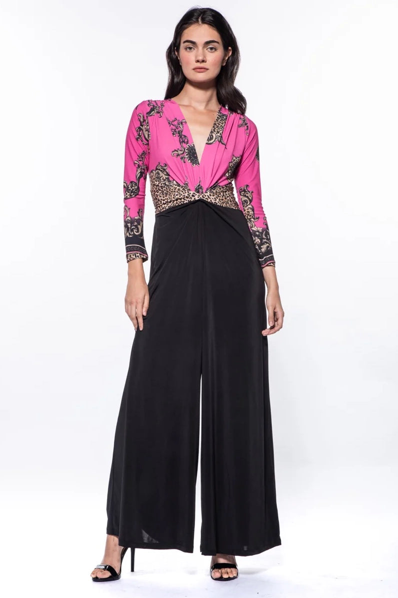 The Amber Mixed V-Neck Wide Leg Jumpsuit reimagines Julian’s signature silhouette with striking contrast and elevated ease. Featuring a plunging neckline, long sleeves, and fluid wide-leg pants, this piece sculpts the waist while delivering a confident, elongated line. The mixed-design bodice adds graphic interest and showcases Julian’s iconic print artistry without compromising the jumpsuit’s timeless sophistication. Ideal for gallery nights, cocktails, or destination dinners—where polish and presence are key.