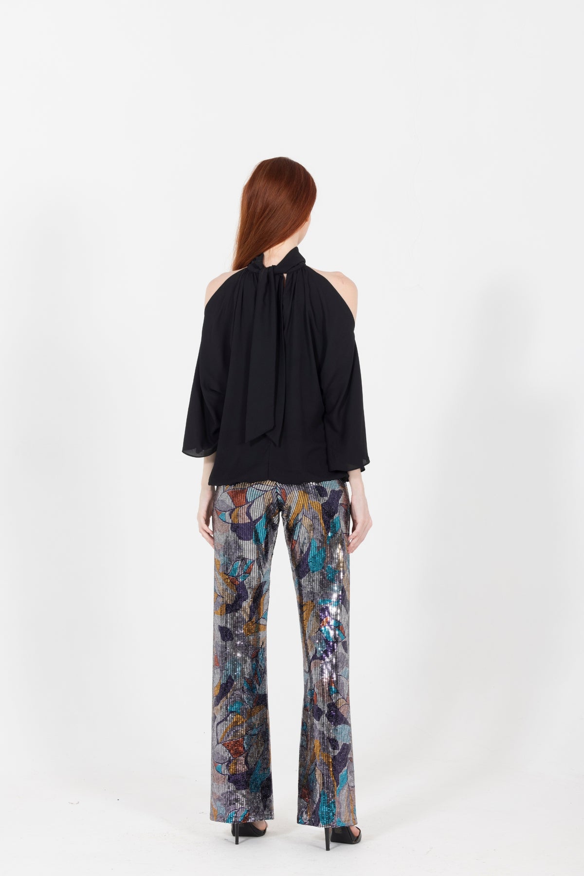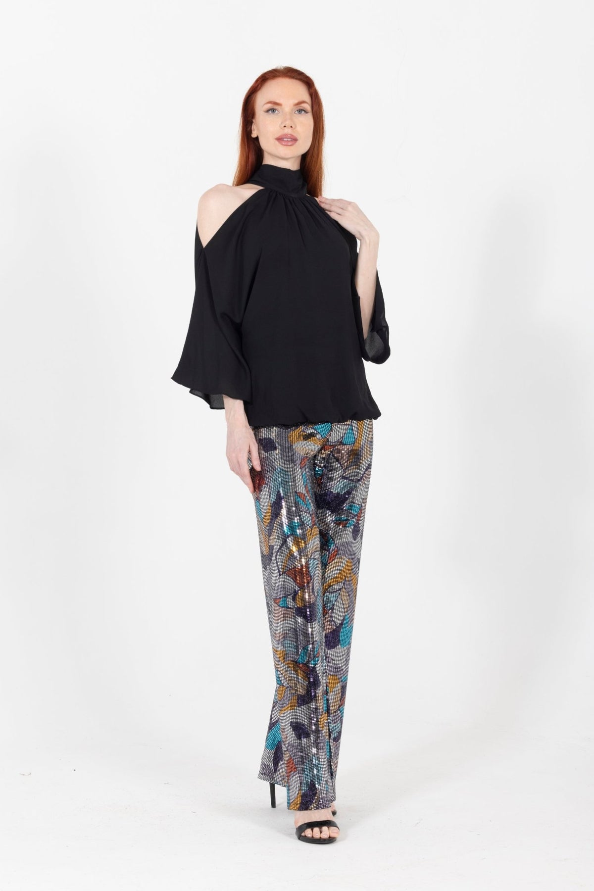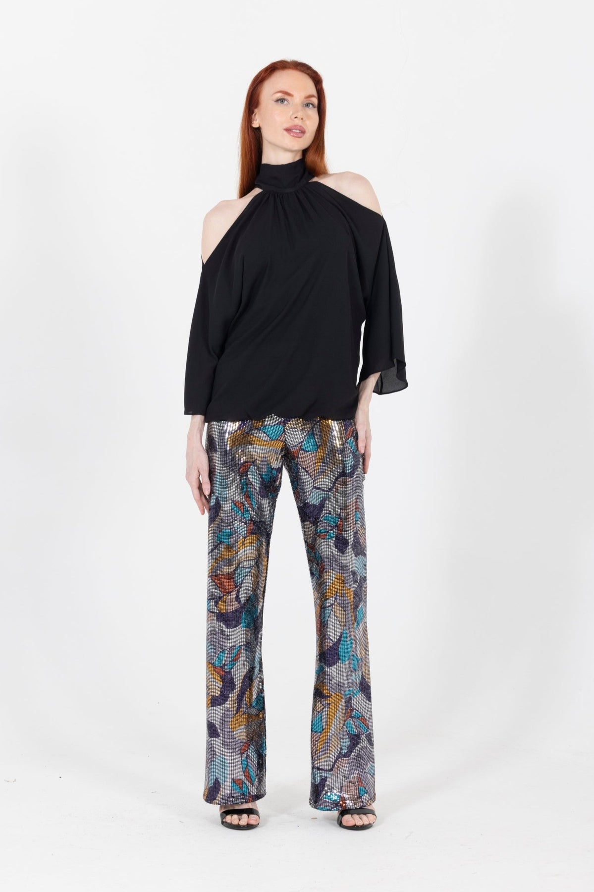 The Ausi Top in Black offers a sleek, contemporary look with its minimalist design, while the Chu Pant in Celebration brings a playful, artistic touch. Together, they create a unique and fashionable ensemble.