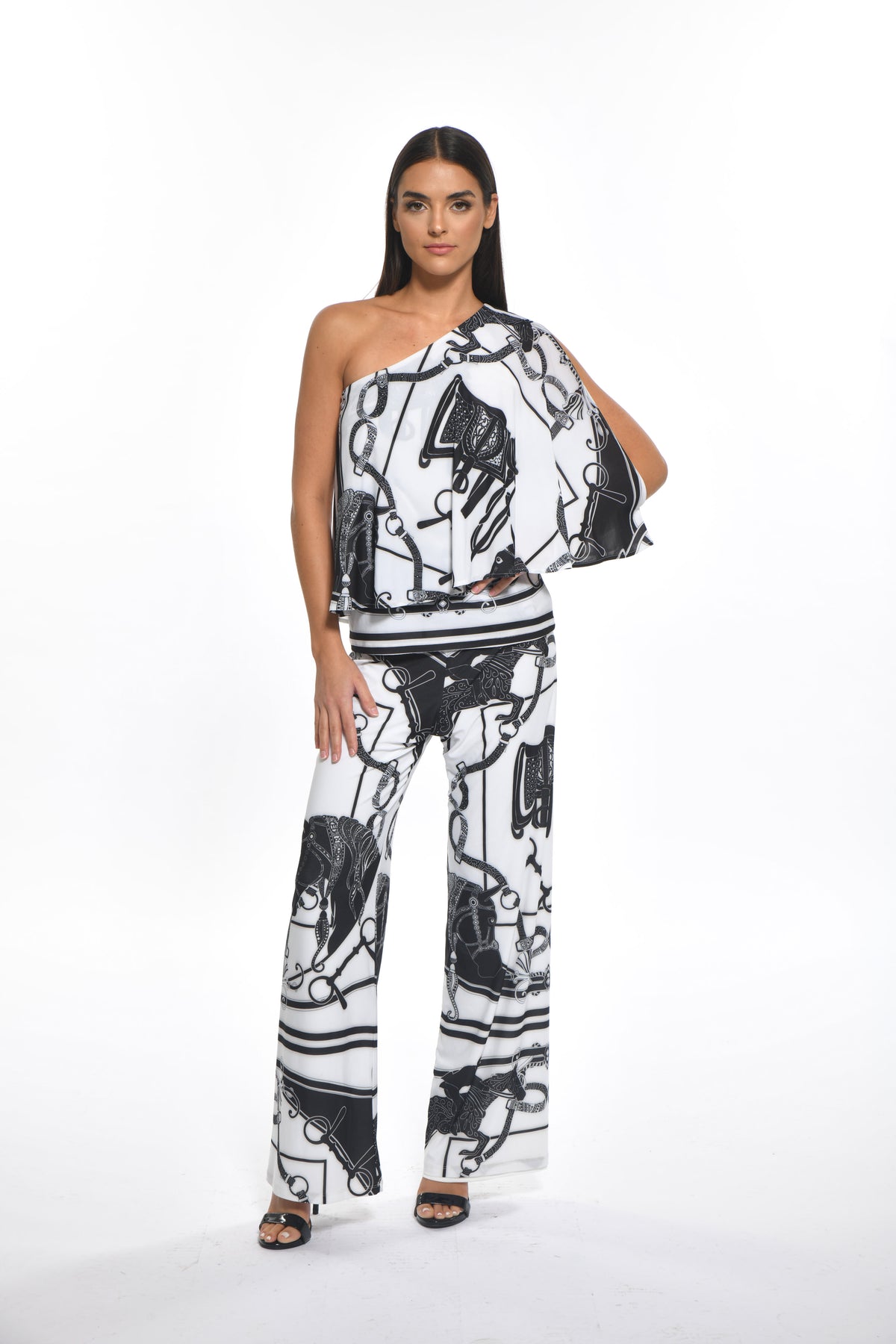 Introducing the Crystal Top – a captivating one-shoulder wonder that effortlessly combines elegance and edginess. The Rome Print adds a touch of history with its black and white silhouette depicting battles in Rome, making it a unique and bold choice for your wardrobe.