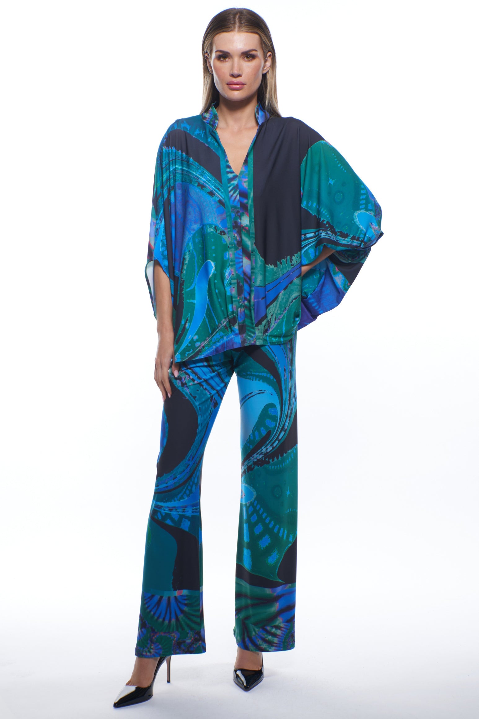 A flowing study in print and proportion, this voluminous blouse pairs a vibrant aquatic palette with soft dolman sleeves and a fluid drape. The oversized silhouette offers endless styling options—half-tucked with trousers, loose over leggings, or knotted at the waist. From gallery tours to alfresco lunches, it’s a wearable statement that moves with ease and commands attention.