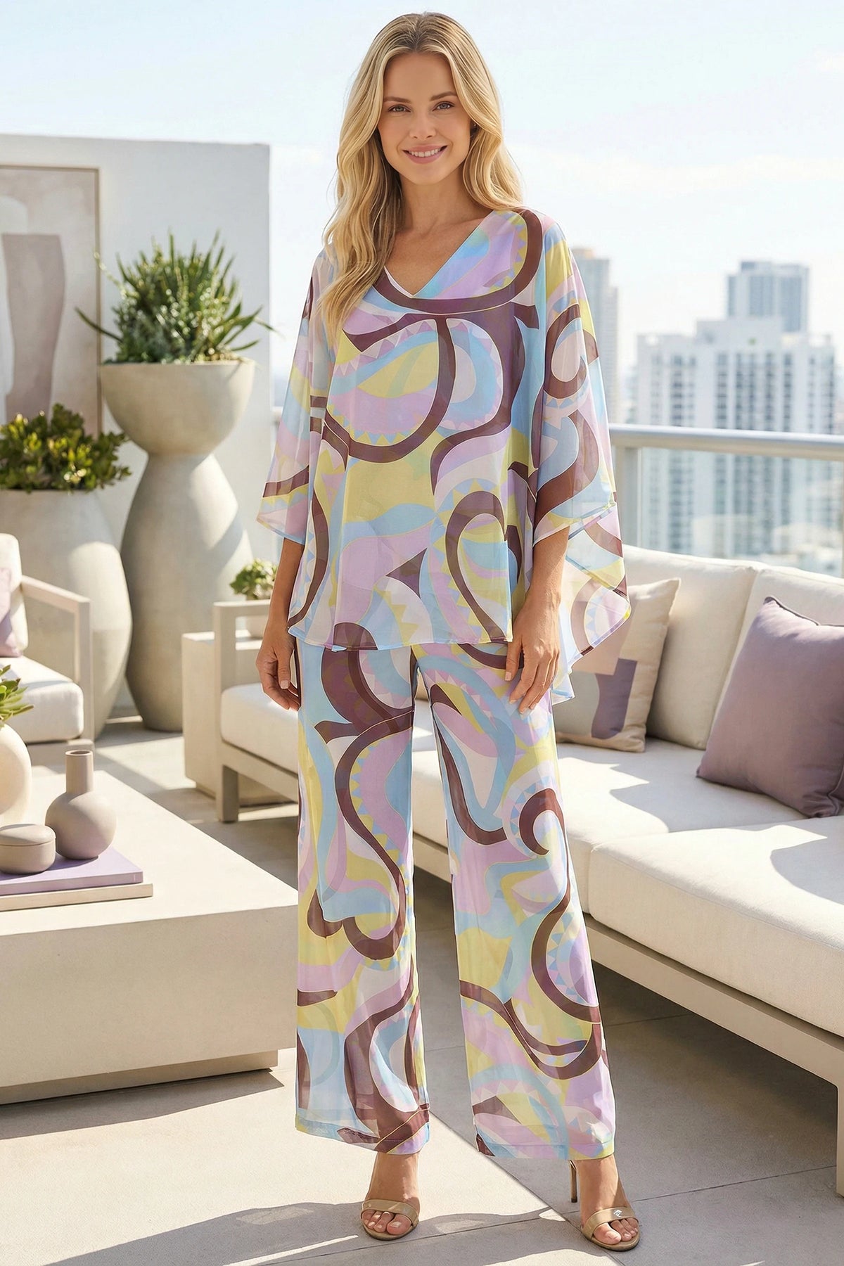 Ease and elegance together when you want coverage without weight. The sheer, relaxed silhouette floats away from the body, while the softly defined V-neckline elongates the neckline and frames the décolletage beautifully. Airy sleeves and fluid drape flatter through the bust and midsection. Style it over the coordinating sheer pant for resort evenings or with a slim trouser for artful, day-to-night polish.