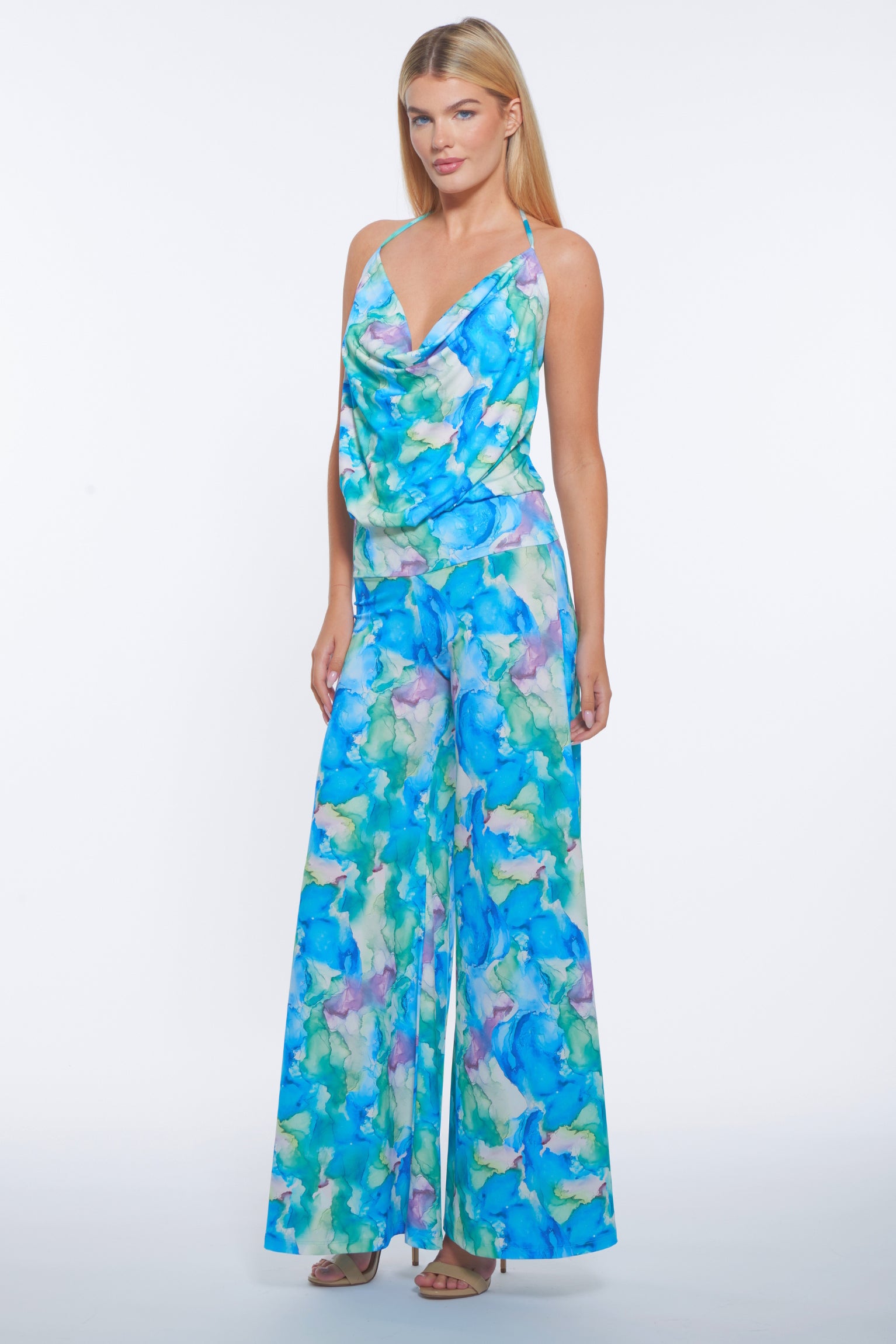 Make a statement in the Lola Halter Wide-Leg Jumpsuit by Julian Chang. Designed with a draped halter neckline and adjustable tie back, this jumpsuit offers a flattering fit that moves with ease. The wide-leg silhouette adds flow and elongation, while the bold artistic prints bring modern glamour to any occasion. Perfect for travel, soirées, or simply standing out in effortless style.