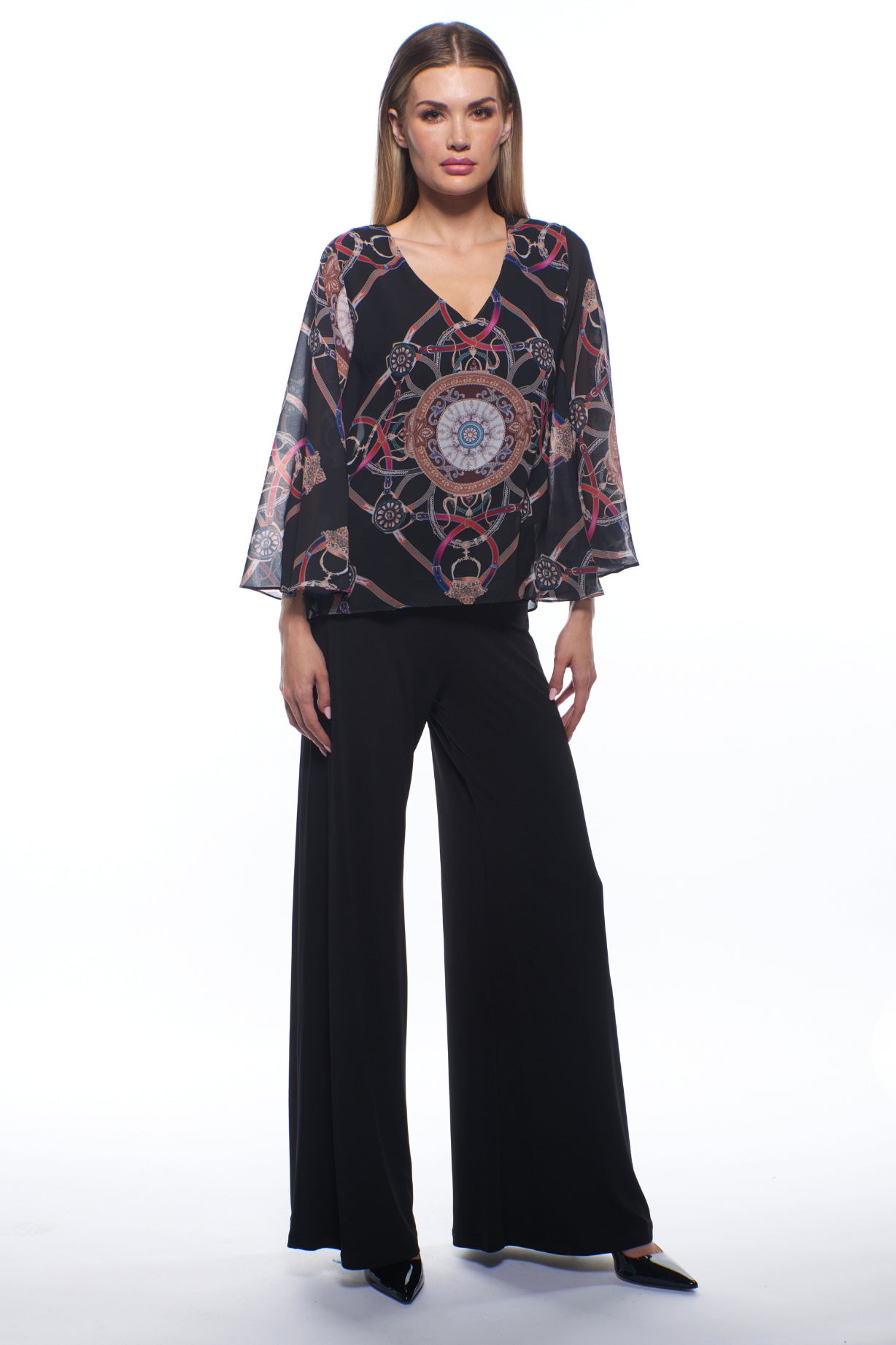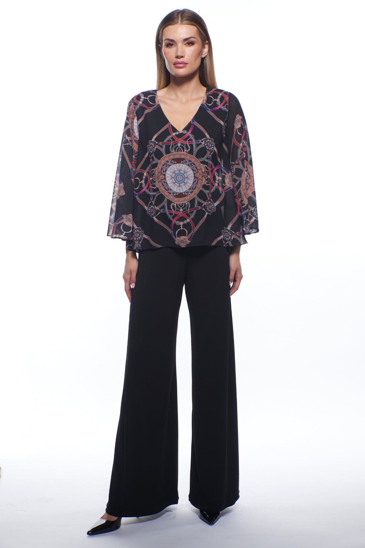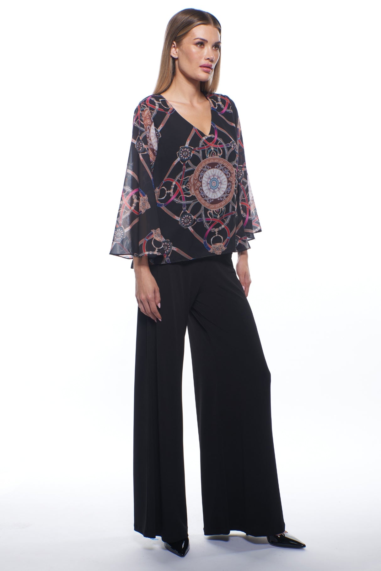 Elevate your wardrobe with a dramatic wide-leg silhouette paired with a bold Gothic-inspired print. The chic V-neck bodice is framed by sheer flowing sleeves, creating a look that balances elegance with ease. Designed in Julian Chang’s signature wrinkle-resistant stretch fabric, this jumpsuit transitions effortlessly from evening occasions to stylish day outings—sophistication without compromise.
