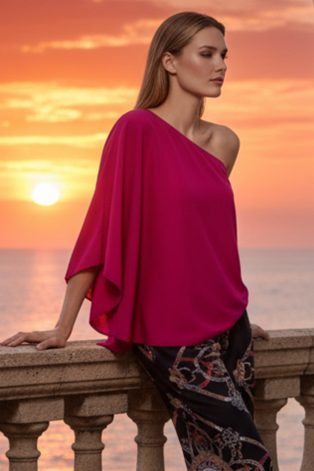 Create an off the runway statement with the Sound Top. Features a tie-neck and a long line cut that flatters the body in a unique way.