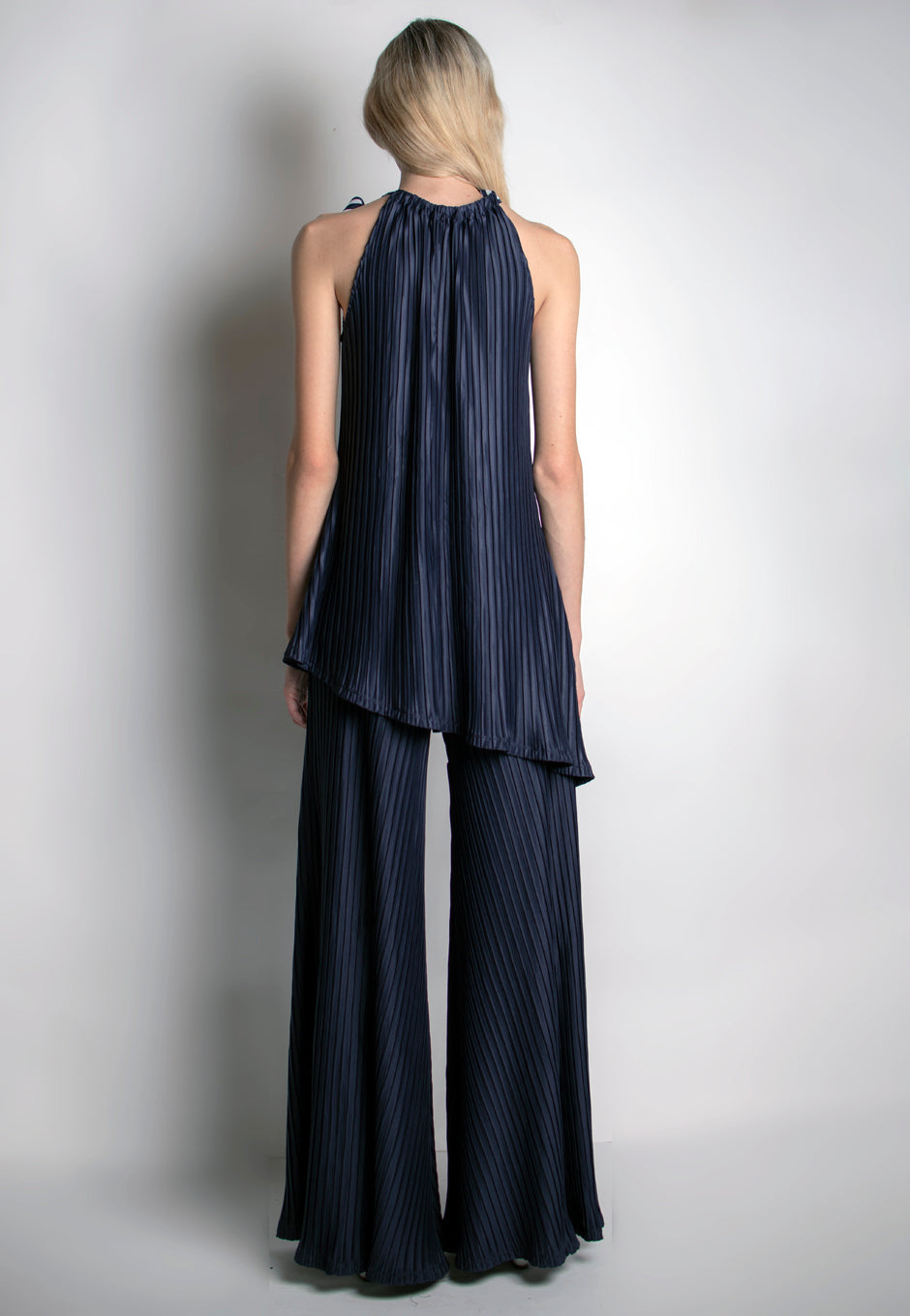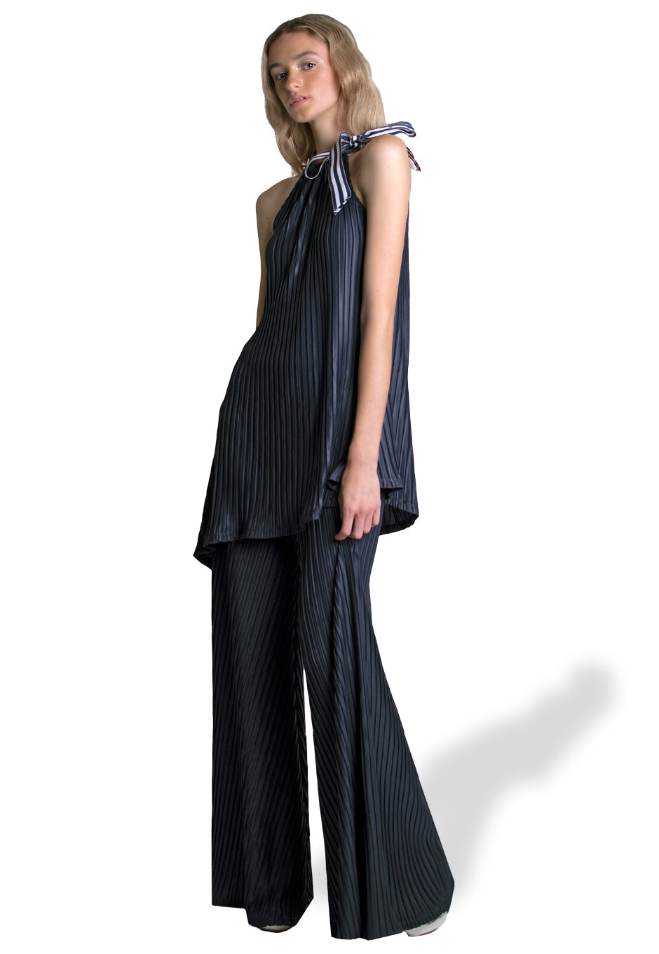 Create an off the runway statement with the Sound Top. Features a tie-neck and a long line cut that flatters the body in a unique way.